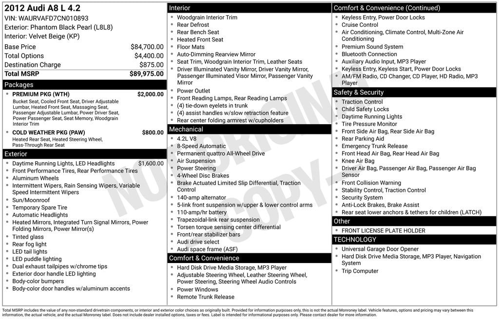 We invite you to experience the unparalleled craftsmanship and refined elegance of this 2012 Audi A8 L 4.2 quattro. Schedule a test drive today and discover the exceptional value and driving pleasure that this exceptional vehicle has to offer.