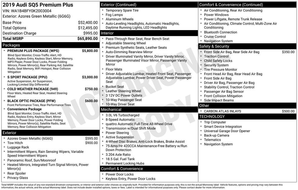 Azores Green Metallic 2019 Audi SQ5 3.0T Premium Plus quattro quattro 8-Speed Automatic with Tiptronic 3.0L TFSI 1 OWNER LOCAL TRADE IN IN SUPER RARE AZOREGREEN METALLIC WITH ROTOR GRAY LEATHER AND ALCANTARA!!!, BLACK OPTIQ PACKAGE AND S SPORT PACKAGE PLUS EVERYTHING ELSE!, IT DOESNT GET BETTER THAN THIS!!!, MUST SEE AND DRIVE!, SQ5 Premium Plus quattro, 4D Sport Utility, 3.0L TFSI, quattro, Rotor Gray w/Leather/Alcantara Seating Surfaces or Fine Nappa Leather Seating Surfaces, 10 Speakers, 4-Wheel Disc Brakes, ABS brakes, Adaptive suspension, Air Conditioning, All Weather Floor Mats, AM/FM radio, Audi Advanced Key, Audi Connect PRIME & PLUS, Audi Phone Box, Audi Pre-Sense Rear, Audi Side Assist, Audi smartphone interface (Apple CarPlay/Android Auto), Audi Virtual Cockpit, Auto-Dimming Power Folding Exterior Mirrors, Auto-dimming Rear-View mirror, Automatic temperature control, Black Optic Package, Carbon Atlas Inlays, Cold Weather Package, Convenience Package, Delay-off headlights, Driver Seat Memory, Exterior Parking Camera Rear, Four wheel independent suspension, Front Bucket Seats, Front dual zone A/C, Front fog lights, Heated door mirrors, Heated Front Seats, Heated front seats, Heated Rear Seats, Heated Steering Wheel, High-Gloss Black Exterior Mirror Housings, Leather/Alcantara Seating Surfaces, Leatherette Covered Center Console, Matte Black Roof Rails, Navigation System, Panic alarm, Panoramic Sunroof, Parking System Plus (Front/Rear Acoustic Sensors), Power driver seat, Power Liftgate, Power passenger seat, Power windows, Premium Plus Package, Radio data system, Radio: MMI Navigation Plus w/MMI Touch, Rain sensing wipers, Rear air conditioning, Rear window wiper, Red Brake Calipers, S Sport Package, SiriusXM All Access Service, Speed-Sensitive Wipers, Split folding rear seat, Spoiler, Sport Adaptive Air Suspension, Sport Rear Differential, Sport steering wheel, Steering wheel mounted audio controls, Tachometer, Telescoping steering wheel, Tilt steering wheel, Titanium Black Exterior Trim, USB Charge Ports for Rear Seats, Wheels: 20" Audi Sport 5-Arm-Rotor Design.