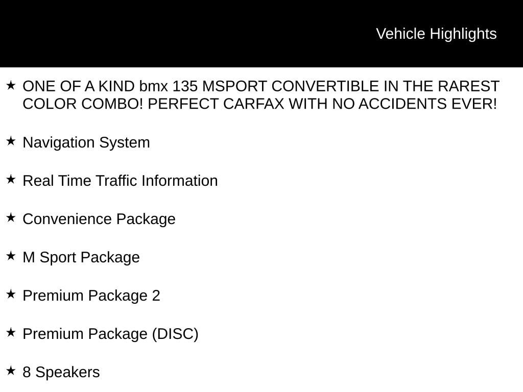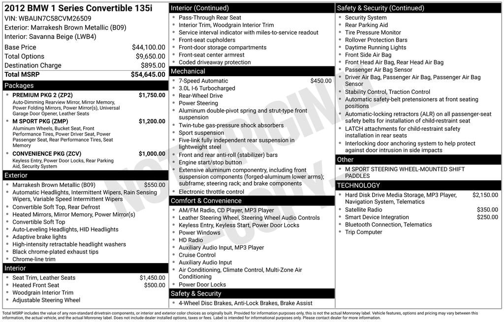 Brown Metallic 2012 BMW 1 Series 135i RWD 7-Speed Double-clutch 3.0L I6 DOHC 24V ONE OF A KIND bmx 135 MSPORT CONVERTIBLE IN THE RAREST COLOR COMBO! PERFECT CARFAX WITH NO ACCIDENTS EVER!, 2D Convertible, 3.0L I6 DOHC 24V, RWD, Brown Metallic, 18" Double-Spoke Light Alloy (Style 261M) Wheels, 4-Wheel Disc Brakes, 8 Speakers, ABS brakes, Air Conditioning, Ambiance Lighting, Anti-Theft Alarm System, Auto-Dimming Rear-View Mirror, Automatic temperature control, BMW Apps, BMW Assist w/Bluetooth®, Boston Leather Upholstery, Brake assist, Comfort Access Keyless Entry, Convenience Package, Convertible roof lining, Cupholders, Delay-off headlights, Electronic Stability Control, Front dual zone A/C, Fully automatic headlights, Glass rear window, Headlight cleaning, Heated door mirrors, High intensity discharge headlights: Bi-xenon, Increased Top Speed Limiter, Interior Mirror w/Compass, Leather Shift Knob, Light Burl Walnut Trim, M Sport Package, M Sports Leather Steering Wheel w/Paddle Shifters, Navigation & BMW Assist w/Enhanced BT & USB w/7KB, Navigation System, Online Information Services, Park Distance Control (Rear), Power driver seat, Power windows, Premium Package (DISC), Premium Package 2, Rain sensing wipers, Real Time Traffic Information, Remote keyless entry, Shadowline Exterior Trim, Smartphone Integration, Speed-sensing steering, Sport Seats, Sport steering wheel, Steering wheel mounted A/C controls, Steering wheel mounted audio controls, Tachometer, Telescoping steering wheel, Tilt steering wheel, Universal Garage-Door Opener, Voice Command System.