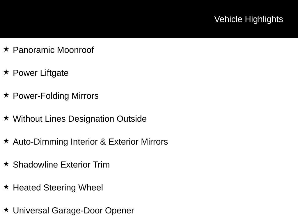 - Panoramic Moonroof, Comfort Access Keyless Entry, and Power-Folding Mirrors