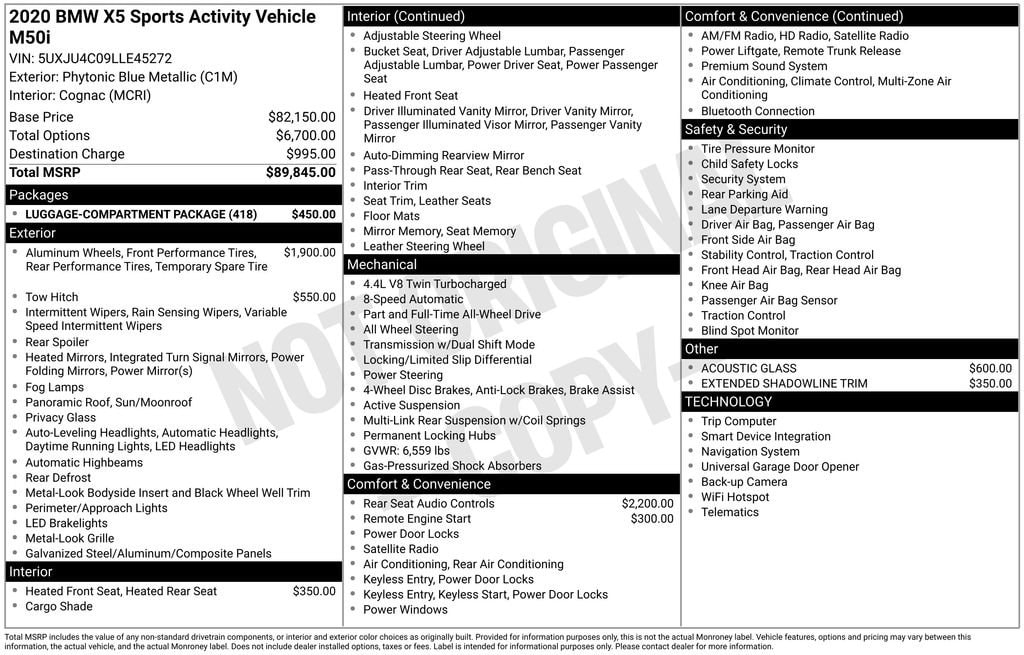 Phytonic Blue Metallic 2020 BMW X5 M50i AWD 8-Speed Automatic 4.4L V8 DOHC 32V Twin Turbocharged 1 OWNER PERFECT CARFAX WITH NO ACCIDENTS EVER AND ALL MAINTENANCE FROM DAY1!, 1 OF A KIND COLOR COMBO AND EVERY FACTORY OPTION!, ACTIVE DRIVE ASSISTANT PRO (LIKE SELF DRIVE), TWIN LCD ENTERTAINMENT SCREENS FOR SECOND ROW!, SUPER RARE ACOUSTIC GLASS PACKAGE!, X5 M50i, 4D Sport Utility, 4.4L V8 DOHC 32V Twin Turbocharged, 8-Speed Automatic, AWD, Phytonic Blue Metallic, 12 Speakers, 4-Wheel Disc Brakes, ABS brakes, Acoustic Glass, Active Driving Assistant Pro, Adaptive M Suspension Professional, Adaptive suspension, Air Conditioning, AM/FM radio: SiriusXM, Apple CarPlay Compatibility, Auto High-beam Headlights, Auto tilt-away steering wheel, Automatic temperature control, Delay-off headlights, Extended Shadowline Trim, Extended Traffic Jam Assistant, Exterior Parking Camera Rear, Four wheel independent suspension, Front & Rear Heated Seats, Front dual zone A/C, Front fog lights, Fully automatic headlights, Garage door transmitter, Gesture Control, harman/kardon® Speakers, Head restraints memory, Head-Up Display, Heated & Cooled Cup Holders, Heated Front Seats, Illuminated entry, Increased Top Speed Limiter, Leather Shift Knob, Leather steering wheel, Luggage-Compartment Package, Memory seat, Multi-Contour Seats, Navigation System, Outside temperature display, Power driver seat, Power moonroof, Power passenger seat, Power windows, Professional Rear-Seat Entertainment, Rain sensing wipers, Rear air conditioning, Rear dual zone A/C, Rear window wiper, Remote Engine Start, Remote keyless entry, Security system, Speed-Sensitive Wipers, Split folding rear seat, Spoiler, Sport steering wheel, Steering wheel memory, Steering wheel mounted audio controls, Tachometer, Telescoping steering wheel, Tilt steering wheel, Trailer Hitch - 7,200 lb Towing Limit, Wheels: 22" x 9.5" Fr & 22" x 10.5" Rr M V-Spoke.