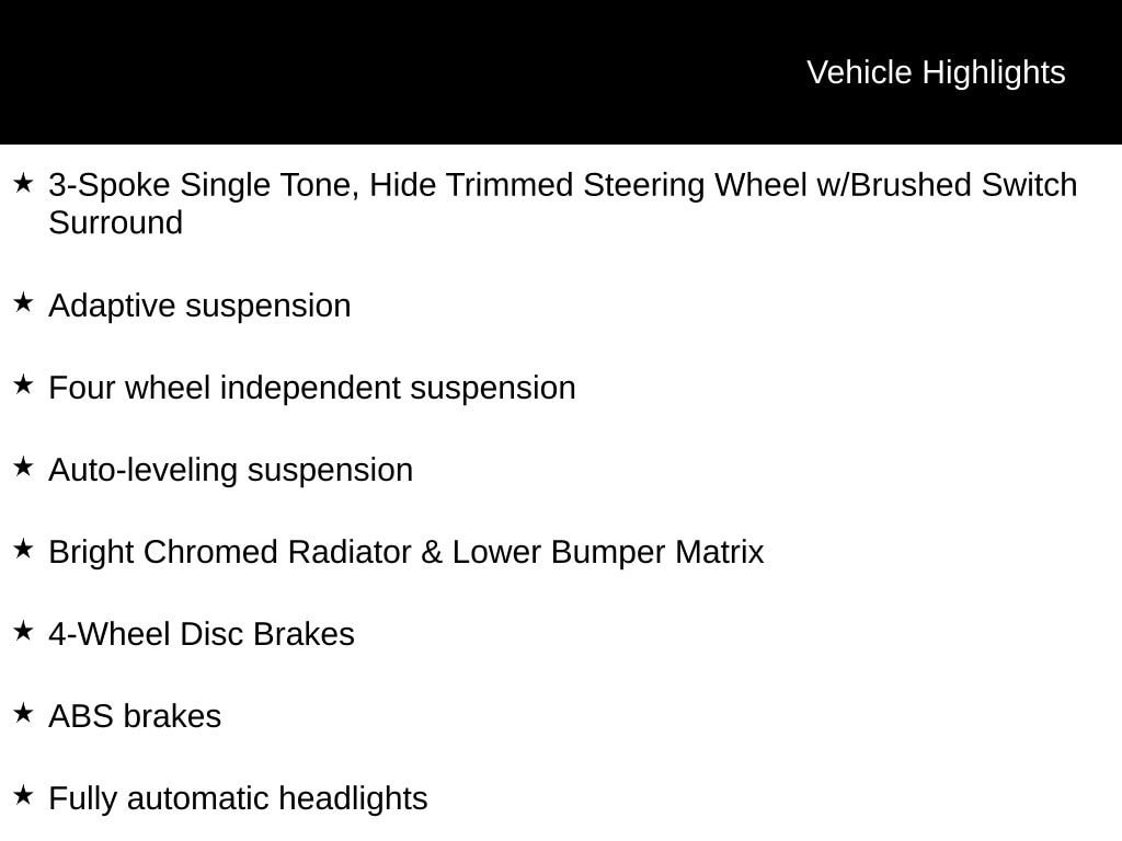 - Adaptive suspension, Auto-leveling suspension, Four wheel independent suspension