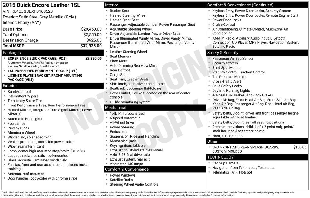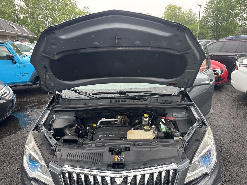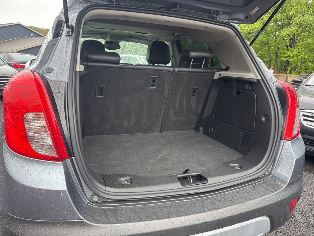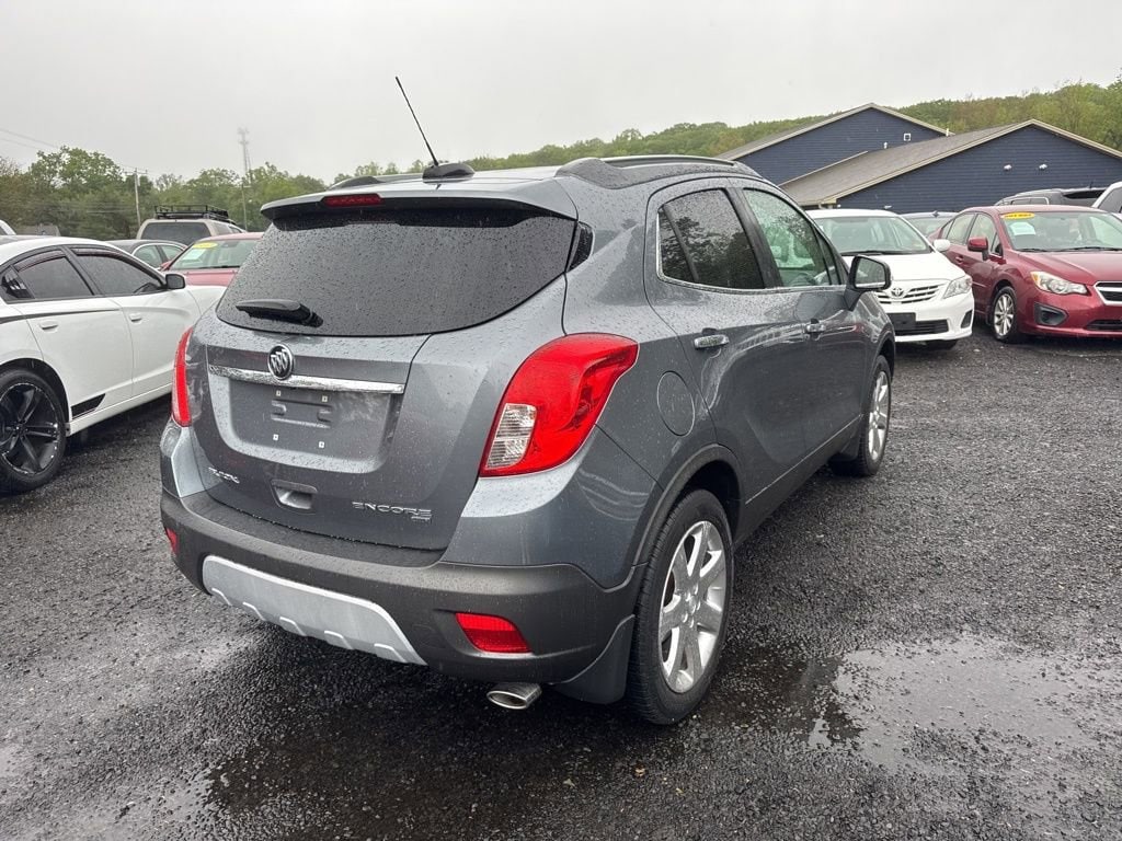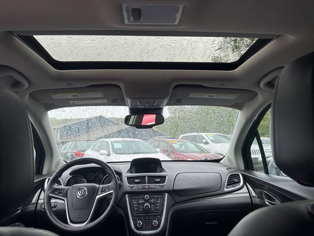 Priced below KBB Fair Purchase Price! Satin Steel Gray Metallic 2015 Buick Encore Leather AWD 6-Speed Automatic Electronic with Overdrive ECOTEC 1.4L I4 SMPI DOHC Turbocharged VVT LOW MILEAGE FULLY LOADED BUICK ENCORE LEATHER GROUP CAR!, MINT CONDITION INSIDE AND OUT!, Encore Leather, 4D Sport Utility, ECOTEC 1.4L I4 SMPI DOHC Turbocharged VVT, AWD, Satin Steel Gray Metallic, Ebony Leather, 4-Wheel Disc Brakes, 6-Way Power Driver Seat Adjuster, 6-Way Power Front Passenger Seat Adjuster, ABS brakes, Air Conditioning, AM/FM radio: SiriusXM, Automatic temperature control, Brake assist, CD player, Delay-off headlights, Dual front impact airbags, Dual front side impact airbags, Electronic Stability Control, Experience Buick Package, Experience Buick Package (DISC), Exterior Parking Camera Rear, Front Bucket Seats, Front dual zone A/C, Front fog lights, Fully automatic headlights, Heated door mirrors, Heated Driver & Front Passenger Seats, Heated steering wheel, Illuminated entry, Leather steering wheel, Leather-Appointed Seat Trim, Memory seat, Outside temperature display, Power door mirrors, Power driver seat, Power passenger seat, Power Tilt-Sliding Moonroof, Power windows, Preferred Equipment Group 1SL, Premium audio system: IntelliLink, Radio: AM/FM Audio System w/MP3 CD Player, Radio: AM/FM Audio System w/Nav/Single CD Player, Remote keyless entry, Ride & Handling Suspension, Security system, SiriusXM Satellite Radio, Speed-sensing steering, Split folding rear seat, Spoiler, Steering wheel mounted audio controls, Tachometer, Telescoping steering wheel, Tilt steering wheel, Traction control, Wheels: 18" Chromed Aluminum (DISC).
