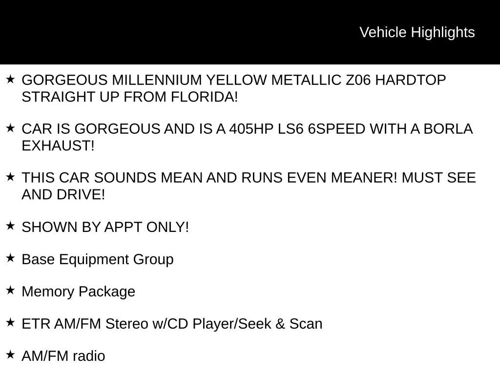 Millennium Yellow 2003 Chevrolet Corvette Z06 Hardtop RWD 6-Speed Manual 5.7L V8 SFI GORGEOUS MILLENNIUM YELLOW METALLIC Z06 HARDTOP STRAIGHT UP FROM FLORIDA!, CAR IS GORGEOUS AND IS A 405HP LS6 6SPEED WITH A BORLA EXHAUST!, THIS CAR SOUNDS MEAN AND RUNS EVEN MEANER! MUST SEE AND DRIVE!, SHOWN BY APPT ONLY!, Corvette Z06 Hardtop, 2D Coupe, 5.7L V8 SFI, 6-Speed Manual, RWD, Millennium Yellow, Black Leather, 4-Wheel Disc Brakes, 6 Speakers, ABS brakes, Air Conditioning, AM/FM radio, Automatic temperature control, Base Equipment Group, Bumpers: body-color, CD player, Delay-off headlights, Electrochromic Inside Rear-View Mirror, Electronic Stability Control, ETR AM/FM Stereo w/CD Player/Seek & Scan, Four wheel independent suspension, Front 17" x 9.5"/Rear 18" x 10.5" Aluminum Wheels, Front Bucket Seats, Front dual zone A/C, Head-Up Display, Heated door mirrors, Highwear Nuance Leather Seat Trim, Leather Shift Knob, Leather steering wheel, Memory Package, Power door mirrors, Power driver seat, Power windows, Remote keyless entry, Security system, Sport steering wheel, Tachometer, Tilt steering wheel, Z06 Bucket Seats.