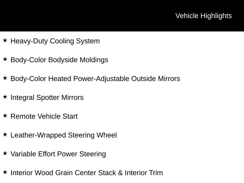 Exterior features like the body-color heated power-adjustable mirrors, front fog lamps, and 18-inch aluminum wheels add a touch of style and functionality. The heavy-duty cooling system and trailer hitch ensure you're ready for any task, while the remote start and leather-wrapped steering wheel offer added convenience.