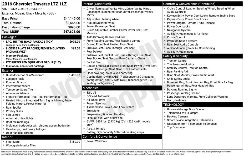 Mosaic Black Metallic 2016 Chevrolet Traverse LTZ AWD 6-Speed Automatic 3.6L V6 SIDI SUPER CLEAN TRAVERSE LTZ WITH ALL OPTIONS INCLUDING HEATED LEATHER, SUNROOF, NAV AND 20' WHEELS!, BLACK ON BLACK WITH QUAD BUSCKETS AND 3RD ROW SEATING!, MUST SEE AND DRIVE!, Traverse LTZ, 4D Sport Utility, 3.6L V6 SIDI, AWD, Mosaic Black Metallic, Ebony Leather, 1st & 2nd Row All-Weather Floor Mats, 20" x 7.5" Machined Aluminum Wheels, 3rd Row All-Weather Floor Mats, 3rd row seats: split-bench, 4-Wheel Disc Brakes, 7-Passenger Seating (2-2-3 Seating Configuration), 8-Way Power Driver Seat, 8-Way Power Passenger Seat Adjuster, ABS brakes, Air Conditioning, AM/FM radio: SiriusXM, Auto-Dimming Inside Rear-View Mirror, Automatic temperature control, Bluetooth® For Phone, Body-Color Moldings w/Chrome Bodyside Accents, Bose Premium 10-Speaker Audio System Feature, CD player, Chrome Assist Steps, Color Touch Navigation System, Delay-off headlights, Dual Exhaust w/Bright Tips, Dual SkyScape 2-Panel Power Sunroof, Enhanced Driver Information Center, Exterior Parking Camera Rear, Forward Collision Alert & Lane Departure Warning, Front dual zone A/C, Front Fog Lamps, Front fog lights, Frontal & Side-Impact Airbags, Fully automatic headlights, Garage door transmitter, Heated & Cooled Driver & Front Passenger Seats, Heated Steering Wheel, Heated steering wheel, Hit The Road Package, Interior Wood Grain Center Stack & Interior Trim, Leather Shift Knob, Leather-Wrapped Steering Wheel, Memory Package, Memory seat, Navigation System, NavTraffic, Perforated Leather-Appointed Seat Trim, Power driver seat, Power passenger seat, Power windows, Power Windows w/Driver Express-Up & Down, Power-Folding Heated Body-Color Outside Mirrors, Preferred Equipment Group 1LZ, Premium audio system: Chevrolet MyLink, Radio: Chevrolet MyLink AM/FM Stereo w/CD & NAV, Rear air conditioning, Rear audio controls, Rear Audio System Controls, Rear Park Assist, Rear Power Liftgate, Remote keyless entry, Remote Vehicle Start, Roof Rack Longitudinal C-Channels&Cross Rails (LPO), Security system, Side Blind Zone Alert & Rear Cross Traffic Alert, SiriusXM Satellite Radio, Steering wheel mounted audio controls, Tachometer, Telescoping steering wheel, Tilt steering wheel, Tri-Zone Automatic Climate Control, Universal Home Remote, Variable Effort Power Steering.