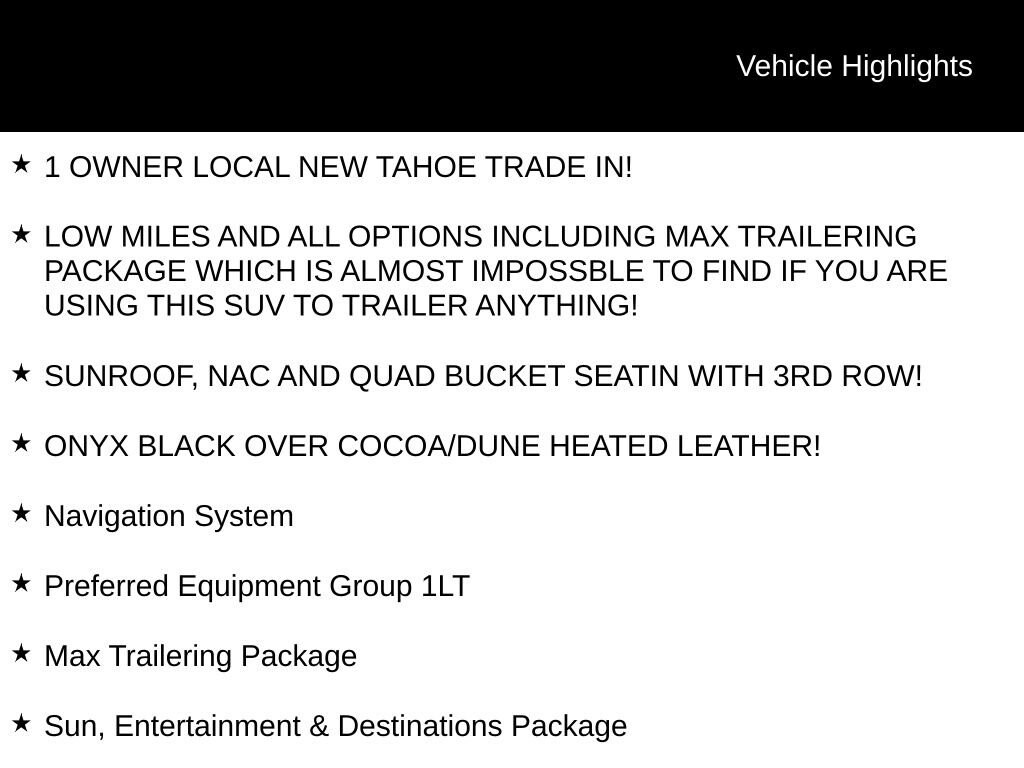 - LOW MILES AND ALL OPTIONS INCLUDING MAX TRAILERING PACKAGE WHICH IS ALMOST IMPOSSBLE TO FIND IF YOU ARE USING THIS SUV TO TRAILER ANYTHING!