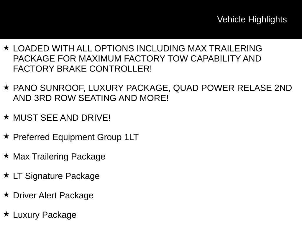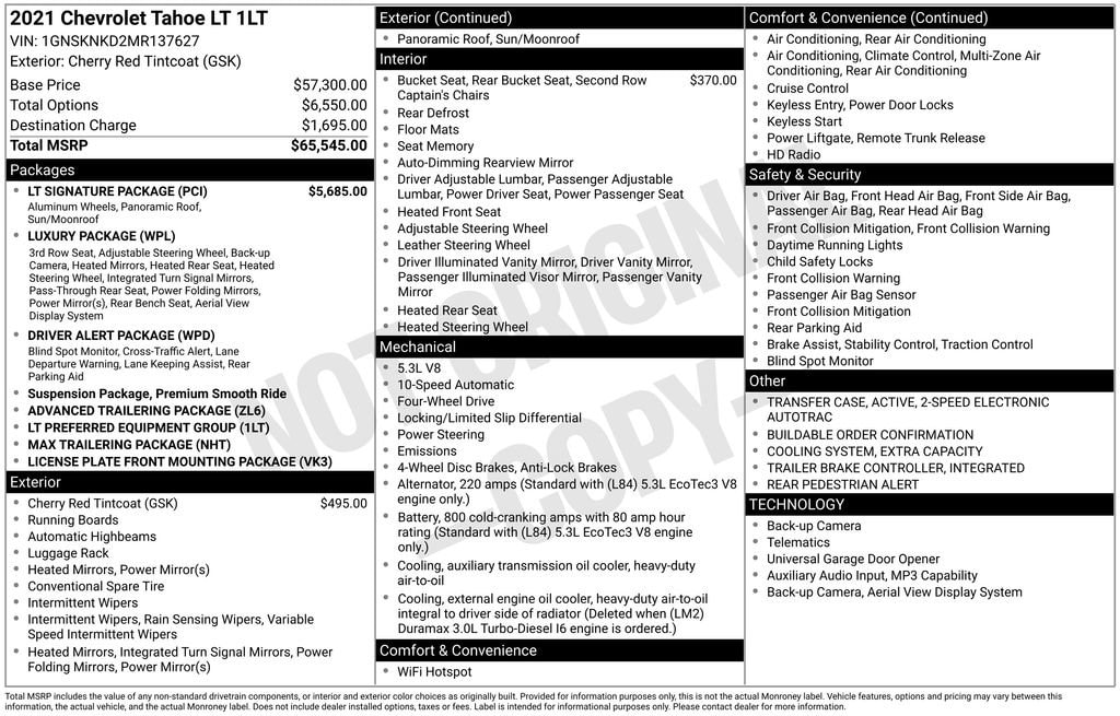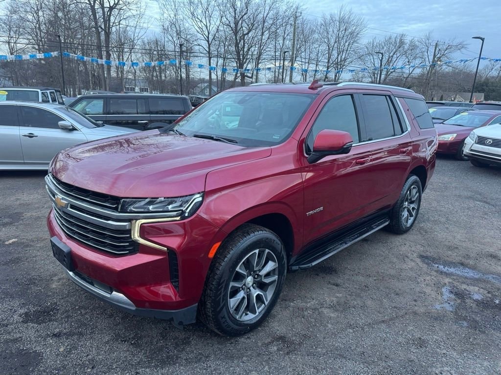 Cherry Red Tintcoat 2021 Chevrolet Tahoe LT 4WD 10-Speed Automatic with Overdrive EcoTec3 5.3L V8 LOADED WITH ALL OPTIONS INCLUDING MAX TRAILERING PACKAGE FOR MAXIMUM FACTORY TOW CAPABILITY AND FACTORY BRAKE CONTROLLER!, PANO SUNROOF, LUXURY PACKAGE, QUAD POWER RELASE 2ND AND 3RD ROW SEATING AND MORE!, MUST SEE AND DRIVE!, Tahoe LT, 4D Sport Utility, EcoTec3 5.3L V8, 10-Speed Automatic with Overdrive, 4WD, Cherry Red Tintcoat, Black Leather, 10-Way Power Driver & Passenger Seat Adjusters, 1st & 2nd Row Color-Keyed Carpeted Floor Mats, 2 USB Data Ports, 2-Speed Active Electronic AutoTrac Transfer Case, 3rd Row 60/40 Power-Folding Split-Bench Seat, 3rd row seats: split-bench, 4-Wheel Disc Brakes, 9 Speakers, ABS brakes, Advanced Trailering Package, Advanced Trailering System, Air Conditioning, AM/FM radio: SiriusXM with 360L, Apple CarPlay/Android Auto, Auto High-beam Headlights, Auto-Dimming Inside Rear-View Mirror, Automatic Heated Steering Wheel, Automatic temperature control, Bose 9-Speaker Stereo Audio System Feature, Bright Front & Rear Door Sill Plates, Color-Keyed Carpeting Floor Covering, Delay-off headlights, Driver & Front Outboard Passenger Airbags, Driver Alert Package, Dual-Pane Power Panoramic Sunroof, Extra Capacity Cooling System, Floor Console w/Storage Area, Front & Rear Park Assist, Front dual zone A/C, Front High-Back Reclining Bucket Seats, Fully automatic headlights, Hands-Free Rear Power Programmable Liftgate, HD Radio, HD Surround Vision, Heated 2nd Row Outboard Seats, Heated door mirrors, Heated Driver & Front Passenger Seats, Heated front seats, Hitch Guidance w/Hitch View, Infotainment Display, Integrated Trailer Brake Controller, Lane Change Alert w/Side Blind Zone Alert, Lane Keep Assist w/Lane Departure Warning, Leather Seat Trim, Leather-Wrapped Steering Wheel, LED Daytime Running Lamps, LT Signature Package, Luxury Package, Max Trailering Package, Memory seat, Memory Settings, Memory Settings for Driver, Outside Heated Power-Adjustable Mirrors, Outside temperature display, Overhead console, Power door mirrors, Power driver seat, Power Liftgate, Power passenger seat, Power Release 2nd Row Bucket Seats, Power Tilt & Telescopic Steering Column, Power windows, Preferred Equipment Group 1LT, Premium audio system: Chevrolet Infotainment 3, Radio: Chevrolet Infotainment 3 Plus System, Rain sensing wipers, Rear air conditioning, Rear Cross Traffic Alert, Rear Pedestrian Alert, Remote keyless entry, Remote Start, Security system, SiriusXM Radio w/360L, Spoiler, Steering wheel mounted audio controls, Tachometer, Telescoping steering wheel, Tilt steering wheel, Universal Home Remote, Wheels: 20" x 9" Painted Aluminum.