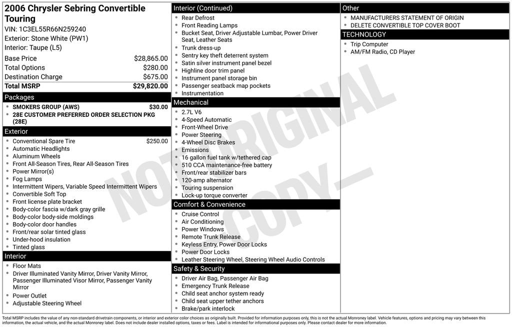 Discover the perfect blend of style, comfort, and performance in this stunning 2006 Chrysler Sebring Touring Convertible. With its sleek white exterior and well-appointed interior, this Sebring Touring is a true head-turner, sure to turn heads wherever you go.