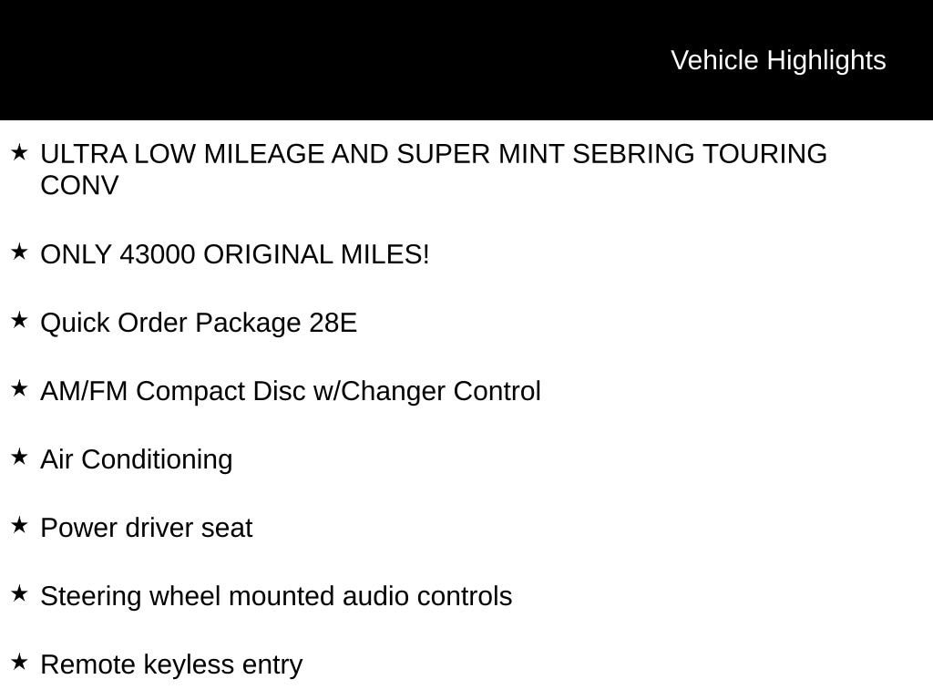 - ULTRA LOW MILEAGE AND SUPER MINT SEBRING TOURING CONV