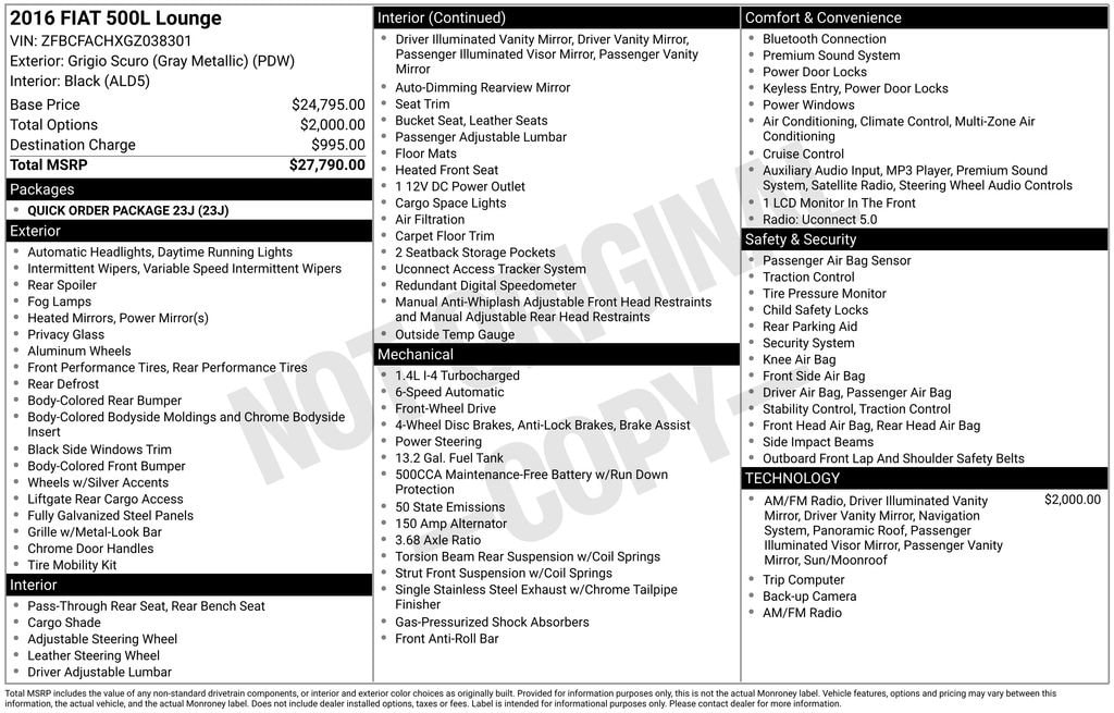 New Price! Grigio Scuro (Gray Metallic) 2016 Fiat 500L Lounge FWD 6-Speed Aisin F21-250 Auto 1.4L I4 16V MultiAir Turbocharged GORGEOUS 1 OWNER FITA LOUNGE WITH A PERFECT CARFAX - NO ACCIDENTS, 500L Lounge, 4D Hatchback, 1.4L I4 16V MultiAir Turbocharged, 6-Speed Aisin F21-250 Auto, FWD, Grigio Scuro (Gray Metallic), Black Leather, 16" Aluminum Wheels, 4-Wheel Disc Brakes, 6 Speakers, ABS brakes, Air Conditioning, AM/FM radio: SiriusXM, Automatic temperature control, Delay-off headlights, Front dual zone A/C, Front fog lights, GPS Navigation, Illuminated entry, Leather steering wheel, Lounge Collection 3, Nav-Capable! See Dealer for Details, ParkView Rear Back-Up Camera, Power Sunroof, Power windows, Premium audio system: Uconnect, Quick Order Package 23J, Radio: Uconnect 6.5, Remote keyless entry, Steering wheel mounted audio controls, Sun Visors w/Illuminated Vanity Mirrors, Tachometer, Telescoping steering wheel, Tilt steering wheel.