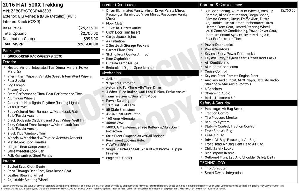 Dressed in a stunning Blue exterior, this Fiat 500X Trekking commands attention wherever it goes. Under the hood, the 2.4L I4 MultiAir engine paired with a 9-Speed 948TE Automatic transmission and AWD delivers a dynamic driving experience, while the impressive fuel economy of 21 city/30 highway MPG ensures you'll spend less time at the pump.