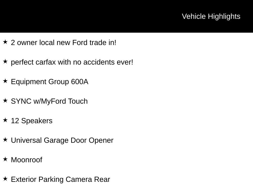 Step inside and you'll be greeted by a wealth of premium amenities, including 12 premium speakers, SYNC with MyFord Touch, a Universal Garage Door Opener, a Moonroof, and a Rear Parking Camera. The Adaptive Cruise Control and Active Park Assist with Forward Sensing System provide added convenience and safety, while the Heated Front Seats and 18" Polished Aluminum Wheels add a touch of luxury.