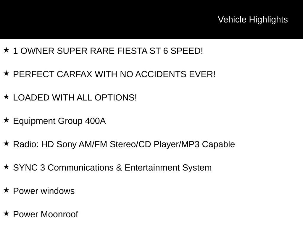 Packed with a wealth of premium features, including a power moonroof, HD Sony audio system, and more, this Fiesta ST is a true driver's delight. Discover the joy of driving with this exceptional vehicle.
