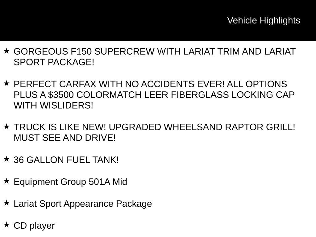 Priced below KBB Fair Purchase Price! Magnetic Metallic 2018 Ford F-150 Lariat 4WD 10-Speed Automatic 3.5L V6 EcoBoost GORGEOUS F150 SUPERCREW WITH LARIAT TRIM AND LARIAT SPORT PACKAGE!, PERFECT CARFAX WITH NO ACCIDENTS EVER! ALL OPTIONS PLUS A $3500 COLORMATCH LEER FIBERGLASS LOCKING CAP WITH WISLIDERS!, TRUCK IS LIKE NEW! UPGRADED WHEELSAND RAPTOR GRILL! MUST SEE AND DRIVE!, 36 GALLON FUEL TANK!, 4D SuperCrew, 3.5L V6 EcoBoost, 10-Speed Automatic, 4WD, Magnetic Metallic, Black w/Black Unique Multi-Contour Leather Bucket Seats, 110V/400W Outlet, 2-Bar Body-Color Grille w/4 Minor Bars, 4-Wheel Disc Brakes, 7 Speakers, ABS brakes, Accent-Color Angular Step Bars, Adjustable pedals, Air Conditioning, Alloy wheels, AM/FM radio: SiriusXM, AppLink/Apple CarPlay and Android Auto, Auto-dimming door mirrors, Automatic temperature control, BLIS Blind Spot Information System, Body-Color Front & Rear Bumpers, Box Side Decals, CD player, Class IV Trailer Hitch Receiver, Compass, Delay-off headlights, Electronic Stability Control, Equipment Group 501A Mid, Exterior Parking Camera Rear, Front dual zone A/C, Front fog lights, Fully automatic headlights, Heated door mirrors, Heated front seats, Illuminated entry, Lariat Sport Appearance Package, LED Sideview Mirror Spotlights, Low tire pressure warning, Memory seat, Outside temperature display, Pedal memory, Power door mirrors, Power driver seat, Power Glass Sideview Mirr w/Body-Color Skull Caps, Power passenger seat, Power windows, Radio data system, Rear seat center armrest, Rear step bumper, Rear window defroster, Remote keyless entry, Remote Start System w/Remote Tailgate Release, Reverse Sensing System, Security system, Single-Tip Chrome Exhaust, Split folding rear seat, Steering wheel mounted audio controls, SYNC 3, Tachometer, Telescoping steering wheel, Tilt steering wheel, Traction control, Trip computer, Turn signal indicator mirrors, Universal Garage Door Opener, Variably intermittent wipers, Ventilated front seats, Wheels: 18" 6-Spoke Machined-Aluminum.