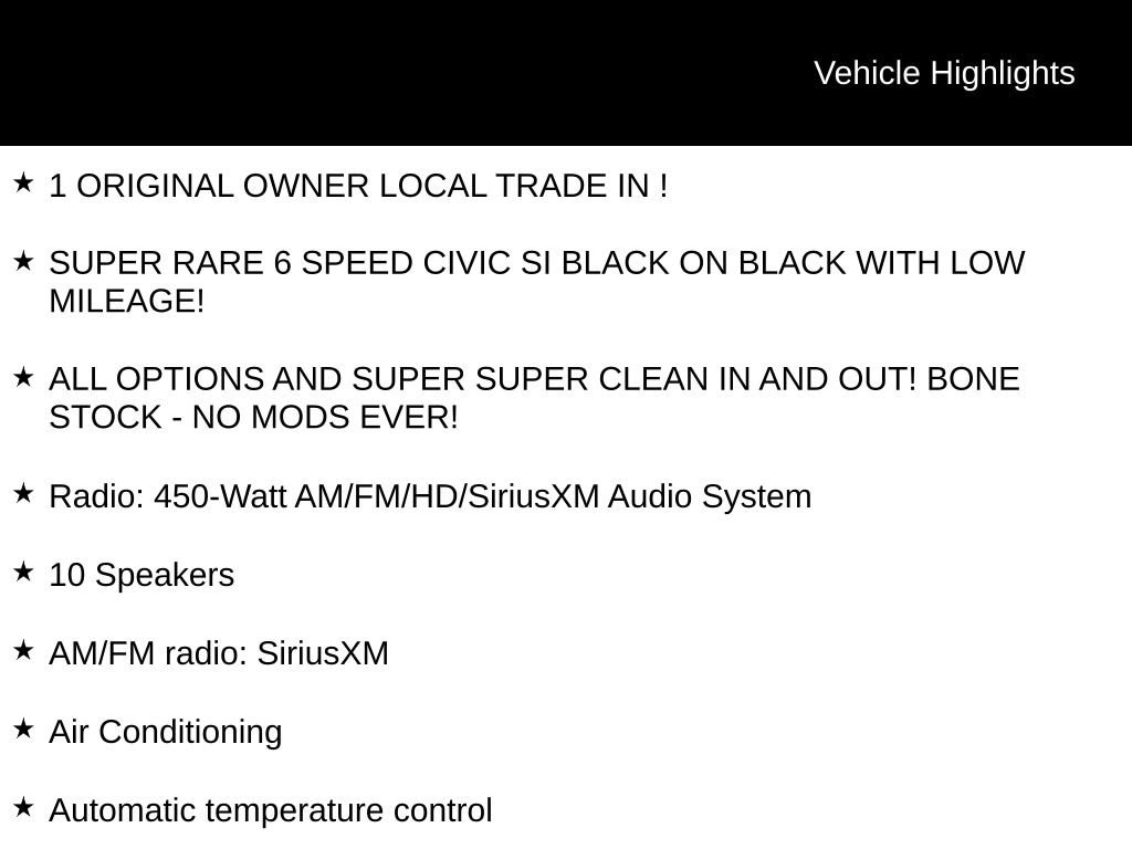 Black 2017 Honda Civic Si FWD 6-Speed Manual 1.5L I-4 DI DOHC Turbocharged 1 ORIGINAL OWNER LOCAL TRADE IN !, SUPER RARE 6 SPEED CIVIC SI BLACK ON BLACK WITH LOW MILEAGE!, ALL OPTIONS AND SUPER SUPER CLEAN IN AND OUT! BONE STOCK - NO MODS EVER!, Civic Si, 2D Coupe, 1.5L I-4 DI DOHC Turbocharged, 6-Speed Manual, FWD, Black, Black Cloth, 10 Speakers, 4-Wheel Disc Brakes, ABS brakes, Air Conditioning, AM/FM radio: SiriusXM, Apple CarPlay/Android Auto, Automatic temperature control, Brake assist, Cloth Seat Trim, Delay-off headlights, Electronic Stability Control, Exterior Parking Camera Rear, Four wheel independent suspension, Front Bucket Seats, Front Center Armrest, Front dual zone A/C, Front fog lights, Fully automatic headlights, Heated door mirrors, Heated front seats, Illuminated entry, Leather Shift Knob, Outside temperature display, Power door mirrors, Power moonroof, Power windows, Radio: 450-Watt AM/FM/HD/SiriusXM Audio System, Reclining Heated Front Bucket Seats, Remote keyless entry, Security system, Speed-sensing steering, Speed-Sensitive Wipers, Split folding rear seat, Spoiler, Steering wheel mounted audio controls, Tachometer, Telescoping steering wheel, Tilt steering wheel, Wheels: 18" Gloss Black Machine-Finished Alloy.