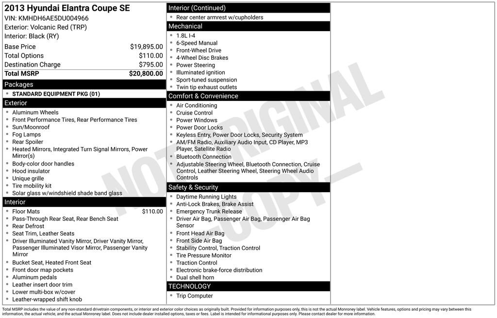 Volcanic Red 2013 Hyundai Elantra SE FWD 6-Speed Manual 1.8L 4-Cylinder DOHC 16V Dual CVVT HARD TO FIND 2 OWNER ELANTRA SE COUPE 6 SPEED MANUAL TRANS!!!, RUNS AND DRIVES LIKE NEW!, BODY AND PAINT EXCELLENT!, Elantra SE, 2D Coupe, 1.8L 4-Cylinder DOHC 16V Dual CVVT, 6-Speed Manual, Volcanic Red, Black Leather, 17" x 7.0J Alloy Wheels, 6 Speakers, 60/40 Split Fold-Down Rear Seatback, ABS w/Electronic Brake Force Distribution (EBD), Advanced Dual Front Airbags, Air Conditioning, Aluminum Pedals, AM/FM radio: XM, Bluetooth® Hands-Free Phone System, Bodycolor Door Handles & Mirrors, CD player, Daytime Running Lights, Delay-off headlights, Dual Heated Power Outside Mirrors, Electronic Stability Control, Front Door Map Pockets, Front Fog Lights, Front fog lights, Heated Front Bucket Seats, Heated front seats, Hood Insulator, Illuminated Vanity Mirrors w/Extensions, Leather Seating Surfaces, Leather Wrapped Steering Wheel & Shift Knob, Leatherette Door Trim Inserts, Manual Air Conditioning, One Touch Up Drivers Window, Option Group 01, Outside temperature display, Power Glass Tilt & Slide Sunroof, Power windows, Power Windows w/Driver's Auto-Down, Rear Center Armrest w/Cupholders, Rear Spoiler, Remote keyless entry, Remote Keyless Entry System w/Alarm, Security system, Side Mirrors w/Integrated Turn Signals, Sliding Center Armrest, Solar Glass, Split folding rear seat, Spoiler, Sport-Tuned Suspension, Steering wheel mounted audio controls, Steering Wheel Mounted Cruise Control, Tachometer, Telescopic Steering Wheel, Tilt Steering Wheel, Tire Pressure Monitoring System, Traction Control System, Trip Computer, Unique Grille, Vehicle Stability Management, Windshield Shade Band.