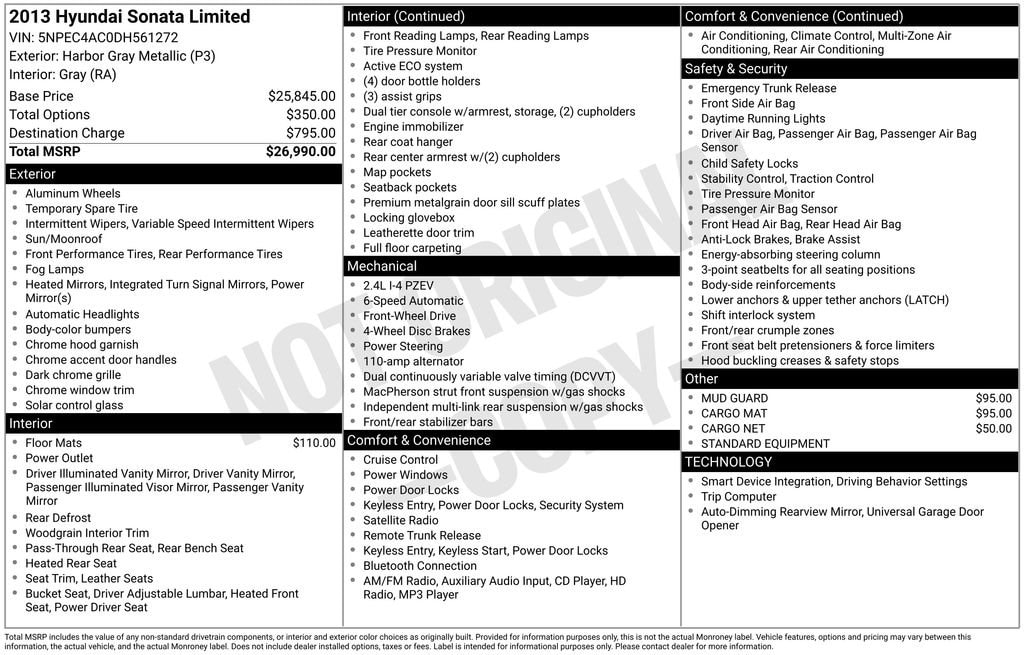 Harbor Gray Metallic 2013 Hyundai Sonata Limited FWD 6-Speed Automatic with Shiftronic 2.4L 4-Cylinder DGI PZEV 1 OWNER VEHICLE WITH 47 SERVICE RECORDS ON CARFAX!, LIMITED WITH HEATED LEATHER AND ALL POWER OPTIONS AND MORE!, RUNS LOOKS AND DRIVES EXCELLENT!, THIS IS A GREAT VALUE!, Sonata Limited, 4D Sedan, 2.4L 4-Cylinder DGI PZEV, 6-Speed Automatic with Shiftronic, Harbor Gray Metallic, Gray Leather, 17 x 6.5J Aluminum Alloy Wheels, 4-Wheel Disc Brakes, 7 Speakers, Active ECO System, Advanced Trip Computer w/Custom Settings, Air Conditioning, AM/FM radio: SiriusXM, Anti-Lock Braking System (ABS), Automatic Light Control, Automatic temperature control, Blue Link Telematics System, Bluetooth® Hands-Free Phone System, Brake assist, CD player, Chrome Exterior Door Handles, Chrome Interior Door Handles, Chrome Window Belt-Line Moldings, Compass, Cruise Control, Dark Chrome Front Grille, Daytime Running Lights, Delay-off headlights, Dual Automatic Climate Control, Electrochromic Auto-Dimming Inside Rear-View Mirror, Electronic Stability Control, Floor Console Mounted Rear Vents, Four wheel independent suspension, Front Active Head Restraints, Front Center Armrest w/Storage, Front dual zone A/C, Front Fog Lights, Front fog lights, Front Seat Side Impact & Curtain Airbags, Fully automatic headlights, Heated door mirrors, Heated Front Bucket Seats, Heated Mirrors, Heated rear seats, HomeLink Integrated Transceiver, Illuminated entry, Leather Seating Surfaces, Leather steering wheel, Leather-Wrapped Steering Wheel & Shift Knob, Mud Guards, Option Group 1, Option Group 1 w/Woodgrain, Outside temperature display, Overhead console, Panoramic Tilt & Slide Front Sunroof, Piano Black Interior Accents, Power door mirrors, Power Locks, Power Windows, Premium Door Sill Plates, Proximity Entry w/Push Button Start, Rear seat center armrest, Rear window defroster, Remote keyless entry, Remote Keyless Entry & Alarm, Security system, Side Mirror Turn Signal Indicators, Solar Control Glass, Speed-sensing steering, Speed-Sensitive Wipers, Split folding rear seat, Steering Wheel Audio Controls, Steering wheel mounted audio controls, Tachometer, Tilt & Telescopic Steering Wheel, Tilt steering wheel, Tire Pressure Monitoring System, Traction Control System, Turn signal indicator mirrors, Woodgrain Interior Accents.