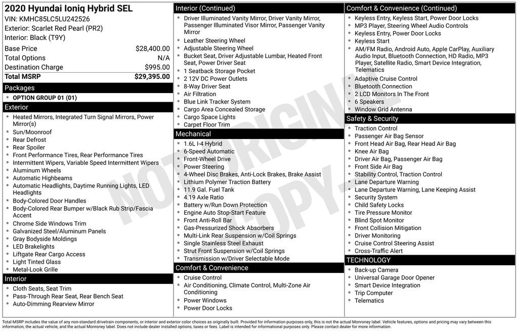 Scarlet Red Pearl 2020 Hyundai Ioniq Hybrid SEL FWD 6-Speed EcoShift Dual Clutch I4 2 OWNER LOCAL TRADE WITH ALL POWER OPTIONS!, HYBRID GETS 50 PLUS MPG!, Ioniq Hybrid SEL, 4D Hatchback, I4, 6-Speed EcoShift Dual Clutch, FWD, Scarlet Red Pearl, Black Cloth, 4-Wheel Disc Brakes, ABS brakes, Air Conditioning, AM/FM radio: SiriusXM, Apple CarPlay & Android Auto, Auto High-beam Headlights, Automatic temperature control, Brake assist, Delay-off headlights, Electronic Stability Control, Exterior Parking Camera Rear, Front dual zone A/C, Fully automatic headlights, Heated Front Bucket Seats, Option Group 01, Power driver seat, Power moonroof, Power windows, Premium Cloth Seating Surfaces, Radio: AM/FM Display Audio, Remote keyless entry, Split folding rear seat, Spoiler, Steering wheel mounted audio controls, Wheels: 17" x 7.0J Eco-Spoke Aluminum Alloy.