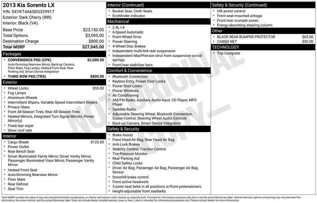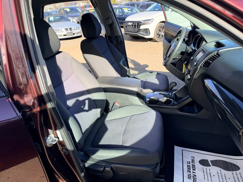 Dark Cherry 2013 Kia Sorento LX FWD 6-Speed Automatic with Sportmatic 2.4L I4 DGI DOHC Dual CVVT Sorento LX, 4D Sport Utility, 2.4L I4 DGI DOHC Dual CVVT, 6-Speed Automatic with Sportmatic, FWD, Dark Cherry, Black Cloth, 3rd Row 50/50 Split-Folding Seat, 3rd Row Package, 4-Wheel Disc Brakes, 6 Speakers, 7.0" x 17" Silver Painted Alloy Wheels, ABS brakes, Air Conditioning, AM/FM radio: SiriusXM, Brake assist, Delay-off headlights, Electronic Stability Control, Exterior Parking Camera Rear, Front Bucket Seats, Heated front seats, Power windows, Premium audio system: UVO, Rear Parking Sensors, Remote keyless entry, Speed control, Split folding rear seat, Steering wheel mounted audio controls, Tricot Fabric Seat Trim.