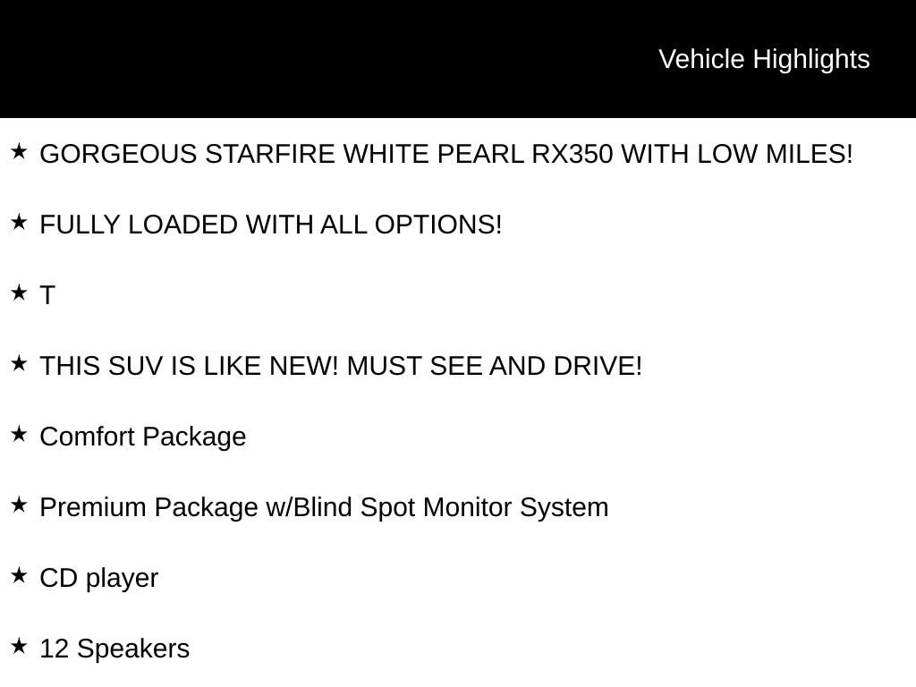 Priced below KBB Fair Purchase Price! Starfire Pearl 2015 Lexus RX 350 FWD 6-Speed Automatic with Sequential Shift ECT-i 3.5L V6 DOHC Dual VVT-i 24V GORGEOUS STARFIRE WHITE PEARL RX350 WITH LOW MILES!, FULLY LOADED WITH ALL OPTIONS!, T, THIS SUV IS LIKE NEW! MUST SEE AND DRIVE!, RX 350, 4D Sport Utility, 3.5L V6 DOHC Dual VVT-i 24V, Starfire Pearl, Parchment w/Leather Seat Trim, 12 Speakers, 18" x 7.5" 5-Spoke Aluminum Wheels, 4-Wheel Disc Brakes, ABS brakes, Air Conditioning, AM/FM radio: SiriusXM, Automatic temperature control, Blind Spot Monitoring Lane Change Assist, CD player, Comfort Package, Delay-off headlights, Driver Seat/Steering/Mirror Memory - 3 Settings, Exterior Parking Camera Rear, Front Bucket Seats, Front dual zone A/C, Front fog lights, Fully automatic headlights, Garage door transmitter: HomeLink, Genuine wood console insert, Genuine wood door panel insert, Heated & Ventilated Front Seats, Heated door mirrors, Leather Seat Trim, One-Touch Open/Close Moonroof, Outside temperature display, Power door mirrors, Power driver seat, Power Liftgate, Power passenger seat, Power windows, Power-Folding Electrochromic Outside Mirrors, Premium Package w/Blind Spot Monitor System, Rain-Sensing Wipers, Rear Armrest Storage w/Lid, Remote keyless entry, Roof Rails, Security system, Split folding rear seat, Tachometer, Telescoping steering wheel, Tilt steering wheel, Wood & Leather-Trimmed Steering Wheel & Shift Knob, Xenon High Intensity Discharge Projector Headlamps.