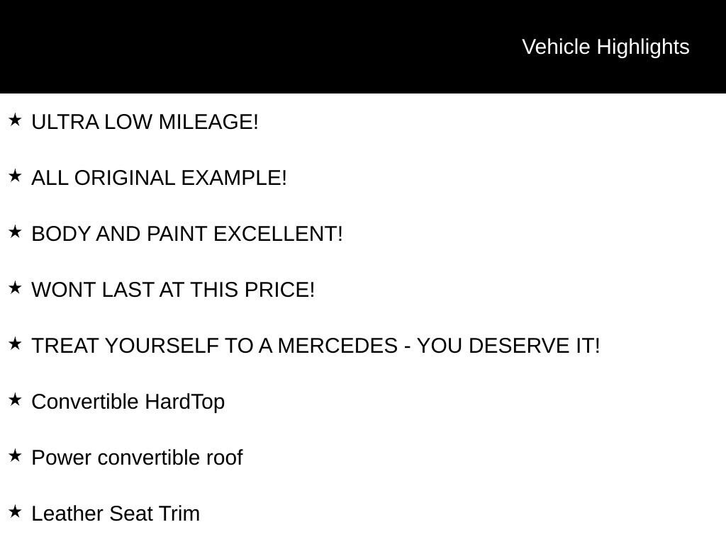 Treat yourself to the unparalleled driving experience of this 2001 Mercedes-Benz SLK SLK 230 Kompressor. With its exceptional condition, low mileage, and impressive list of features, this convertible is a true gem that won't last long on our lot. Visit our showroom today and let us demonstrate why this SLK is the perfect choice for the discerning driver.