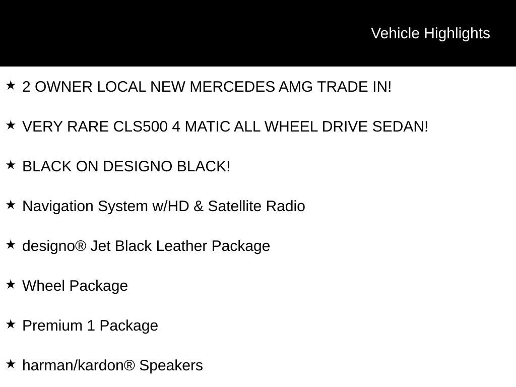 Discover the exceptional 2014 Mercedes-Benz CLS CLS 550 4MATIC®, a true masterpiece of German engineering and design. This rare, one-of-a-kind sedan boasts a captivating Black exterior complemented by a stunning Designo Black leather interior, creating a bold and sophisticated presence on the road.