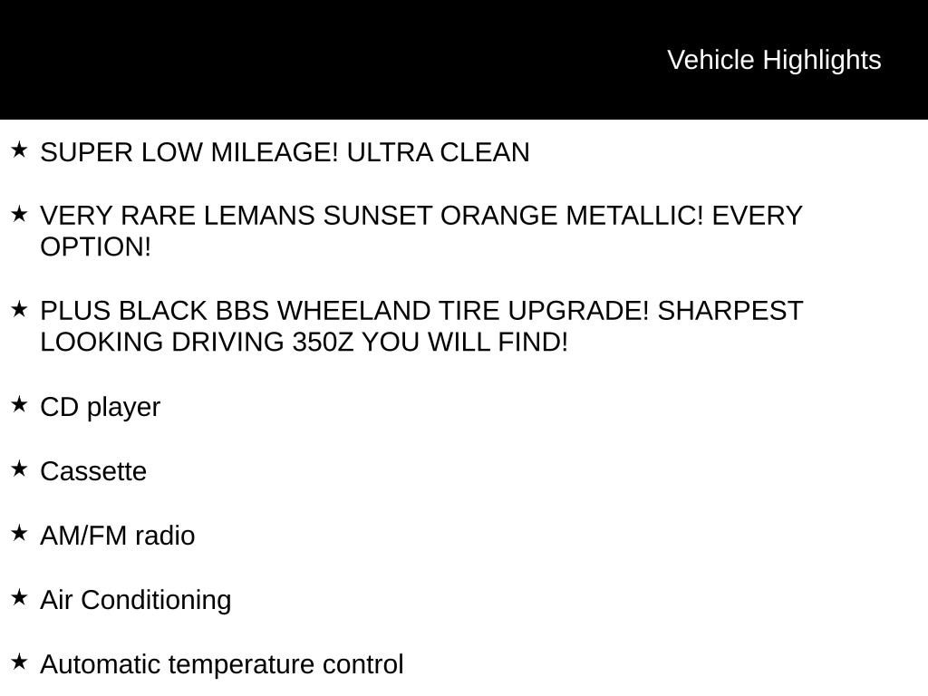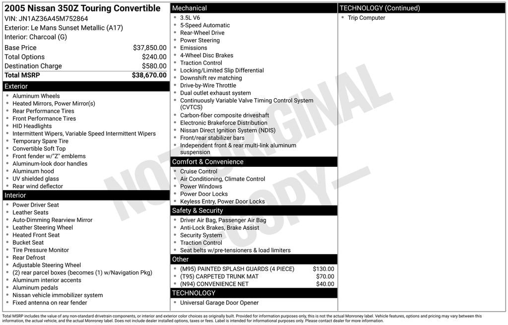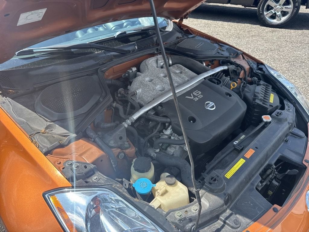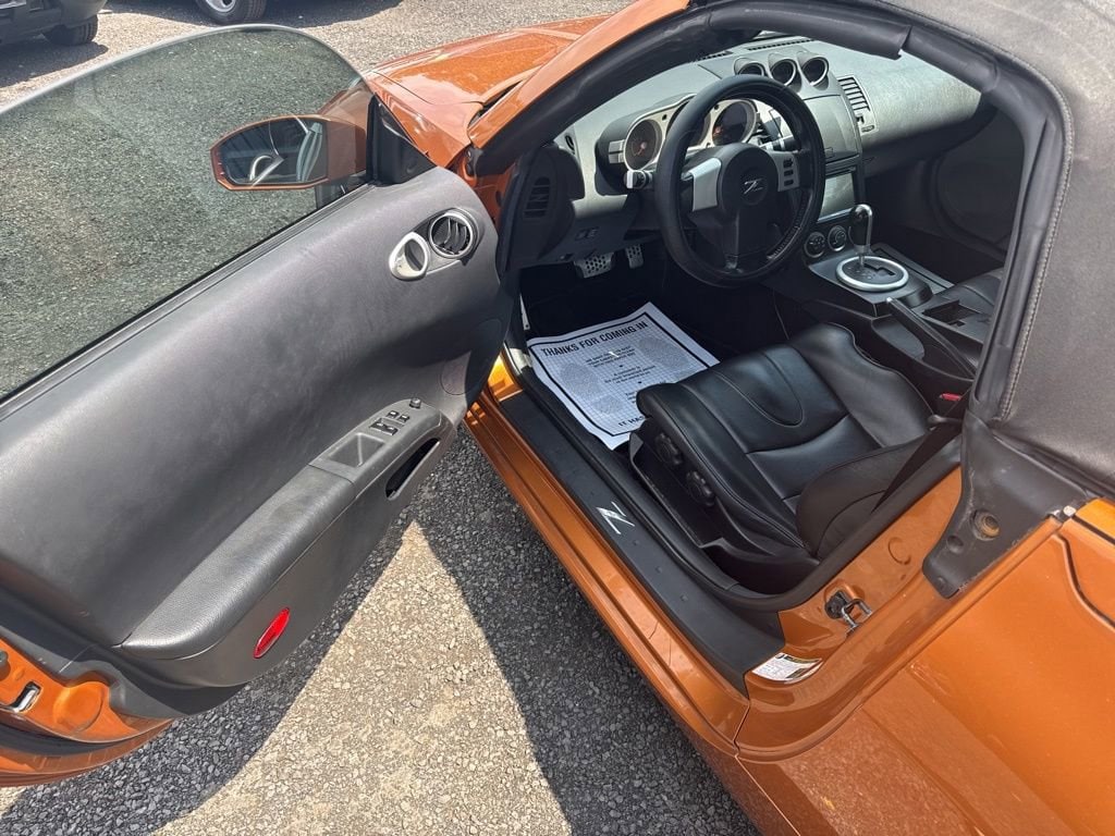 Le Mans Sunset Clearcoat Metallic 2005 Nissan 350Z Touring RWD 5-Speed Automatic Electronic with Overdrive 3.5L V6 DOHC 24V SUPER LOW MILEAGE! ULTRA CLEAN, VERY RARE LEMANS SUNSET ORANGE METALLIC! EVERY OPTION!, PLUS BLACK BBS WHEELAND TIRE UPGRADE! SHARPEST LOOKING DRIVING 350Z YOU WILL FIND!, 350Z Touring, 2D Convertible, 3.5L V6 DOHC 24V, 5-Speed Automatic Electronic with Overdrive, RWD, Le Mans Sunset Clearcoat Metallic, Charcoal Leather, 18" 6-Spoke Alloy Wheels, 4-Wheel Disc Brakes, ABS brakes, Air Conditioning, AM/FM radio, Automatic temperature control, Bose AM/FM Stereo w/In-Dash 6 Disc CD Chngr, Brake assist, Cassette, CD player, Convertible roof lining, Convertible roof wind blocker, Four wheel independent suspension, Garage door transmitter: HomeLink, Glass rear window, Heated Front Sport Bucket Seats, High intensity discharge headlights: Xenon, Illuminated entry, Leather Seat Trim, Leather Shift Knob, Power convertible roof, Power steering, Power windows, Remote keyless entry, Security system, Speed-sensing steering, Tachometer, Tilt steering wheel, Traction control.