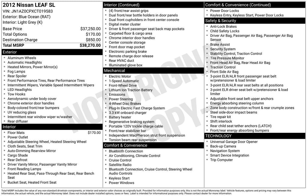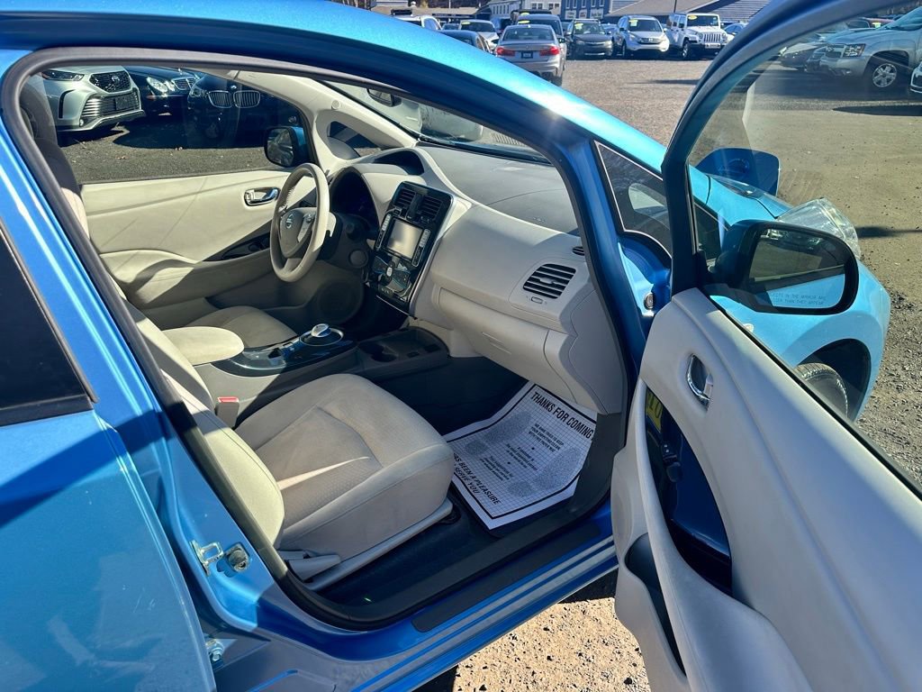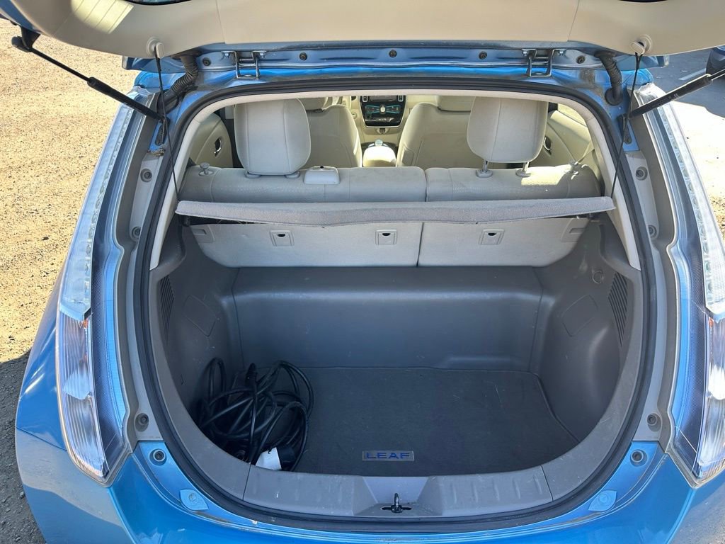 Blue Ocean 2012 Nissan Leaf SL FWD Single Speed Reducer 80kW AC Synchronous Electric Motor ULTRA LOW MILEAGE NISSAN LEAF IN ABSOLUTELY MINT CONDITION THROUGHOUT!, Leaf SL, 4D Hatchback, 80kW AC Synchronous Electric Motor, FWD, Blue Ocean, Light Grey Cloth, 16" Aluminum Alloy Wheels, 4-Wheel Disc Brakes, 6 Speakers, ABS brakes, Air Conditioning, Alloy wheels, AM/FM radio: SiriusXM, Automatic temperature control, Brake assist, CD player, Electronic Stability Control, Exterior Parking Camera Rear, Front Bucket Seats, Front fog lights, Front reading lights, Fully automatic headlights, Garage door transmitter: HomeLink, Heated Front Bucket Seats, Heated rear seats, Heated steering wheel, Illuminated entry, Navigation System, Overhead console, Panic alarm, Partially Recycled Cloth Seat Fabric, Passenger vanity mirror, Power door mirrors, Power windows, Radio: AM/FM/Single In-Dash CD/MP3/WMA, Rear window wiper, Remote keyless entry, Security system, Speed control, Speed-sensing steering, Split folding rear seat, Spoiler, Steering wheel mounted audio controls, Tilt steering wheel, Traction control.