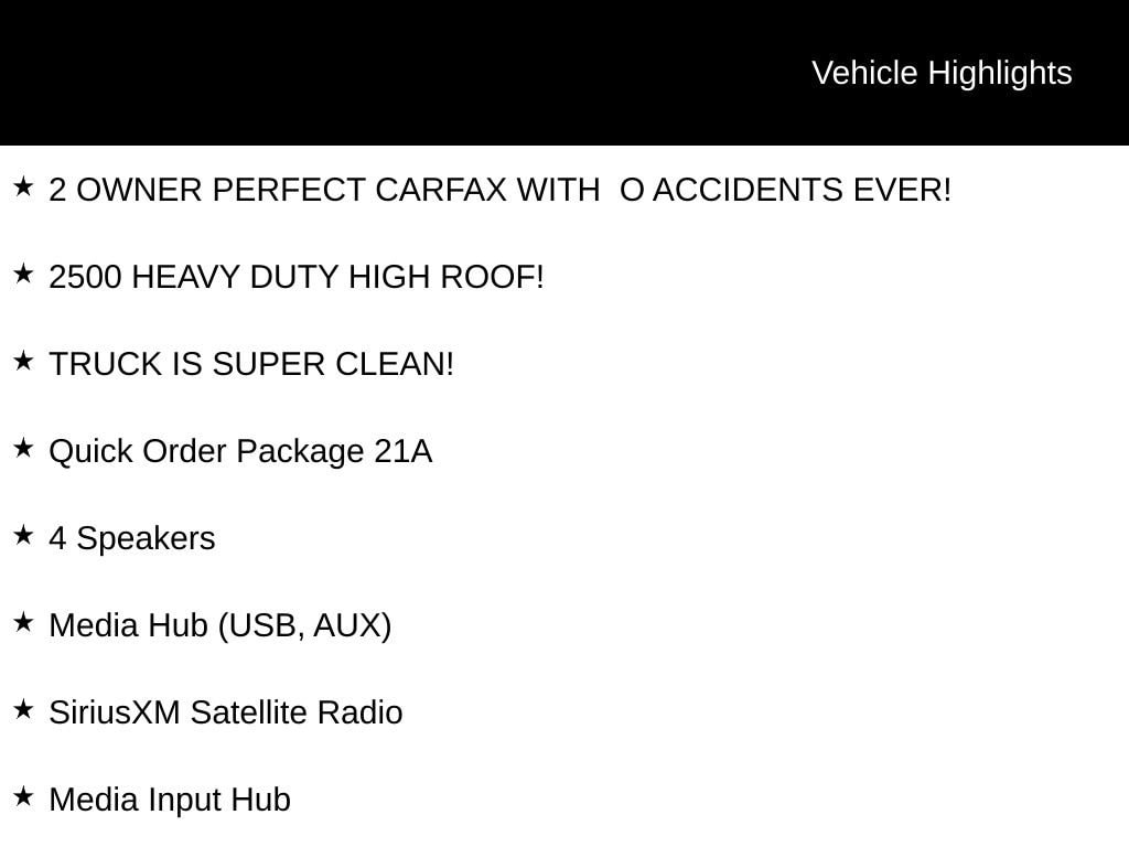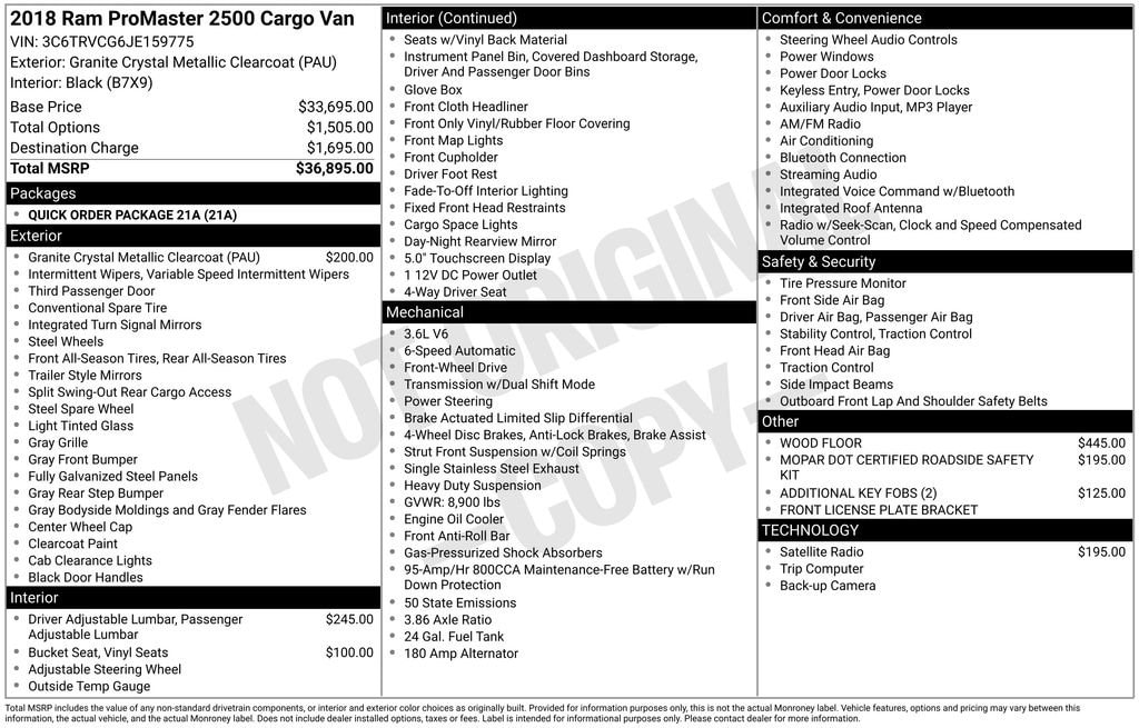 Granite Crystal Metallic Clearcoat 2018 Ram ProMaster 2500 High Roof FWD 6-Speed Automatic 3.6L V6 24V VVT 2 OWNER PERFECT CARFAX WITH O ACCIDENTS EVER!, 2500 HEAVY DUTY HIGH ROOF!, TRUCK IS SUPER CLEAN!, ProMaster 2500 High Roof, 3D Cargo Van, 3.6L V6 24V VVT, Granite Crystal Metallic Clearcoat, Black w/Cloth Bucket Seats or Vinyl Bucket Seats, 1-Yr SiriusXM Radio Service, 4 Speakers, 4-Wheel Disc Brakes, 5.0" Touchscreen Display, ABS brakes, Air Conditioning, AM/FM radio, Bodyside moldings, Brake assist, Center Wheel Cap, Cloth Bucket Seats, Driver/Passenger 6-Way Adjustable Lumbar Seats, Dual front impact airbags, Electronic Stability Control, For More Info, Call 800-643-2112, Front Bucket Seats, Front wheel independent suspension, Heavy Duty Suspension, Illuminated entry, Integrated Voice Command w/Bluetooth, Media Hub (USB, AUX), Media Input Hub, Outside temperature display, ParkView Rear Back-Up Camera, Power windows, Quick Order Package 21A, Radio: Uconnect 3 w/5" Display, Remote keyless entry, SiriusXM Satellite Radio, Steering Wheel Mounted Audio Controls, Steering wheel mounted audio controls, Tachometer, Telescoping steering wheel, Trip computer, Variably intermittent wipers, Wheels: 16" x 6.0" Steel, Wood Floor.