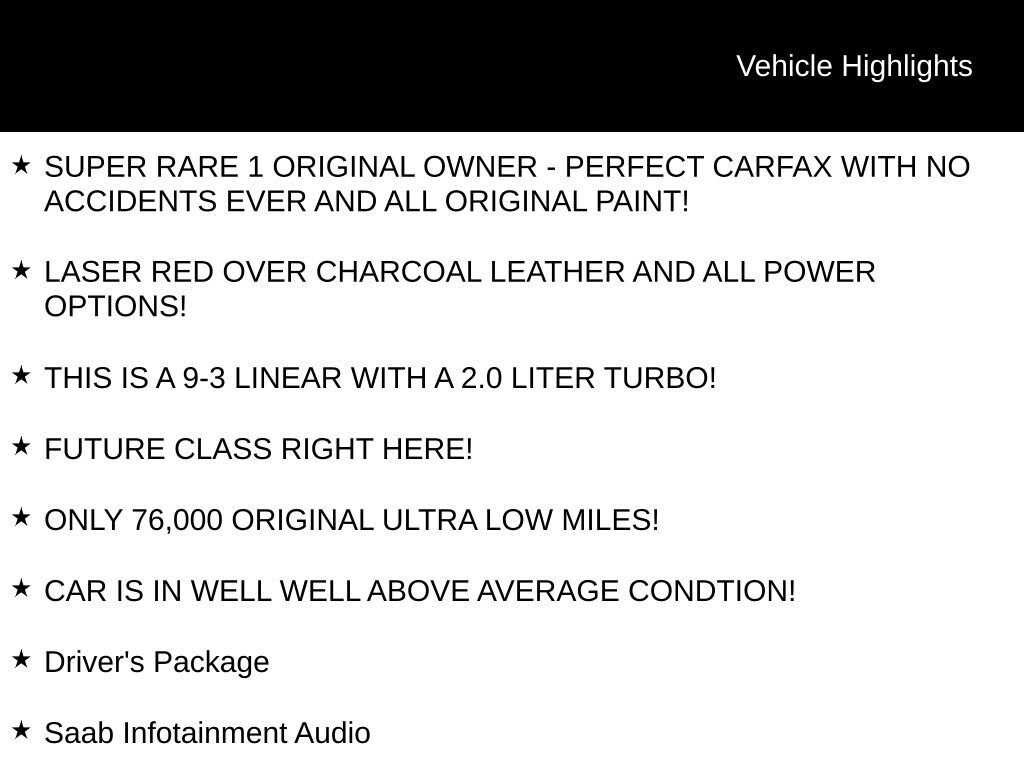 Laser Red 2003 Saab 9-3 Linear FWD 5-Speed Automatic with Sentronic 2.0L I4 MPI DOHC Turbocharged SUPER RARE 1 ORIGINAL OWNER - PERFECT CARFAX WITH NO ACCIDENTS EVER AND ALL ORIGINAL PAINT!, LASER RED OVER CHARCOAL LEATHER AND ALL POWER OPTIONS!, THIS IS A 9-3 LINEAR WITH A 2.0 LITER TURBO!, FUTURE CLASS RIGHT HERE!, ONLY 76,000 ORIGINAL ULTRA LOW MILES!, CAR IS IN WELL WELL ABOVE AVERAGE CONDTION!, 9-3 Linear, 4D Sedan, 2.0L I4 MPI DOHC Turbocharged, 5-Speed Automatic with Sentronic, FWD, Laser Red, 15" x 6.5" Alloy Wheels, 4-Wheel Disc Brakes, 7 Speakers, ABS brakes, Air Conditioning, AM/FM Stereo w/In-Dash CD, Bodyside moldings, Bumpers: body-color, Delay-off headlights, Driver's Package, Electronic Stability Control, Four wheel independent suspension, Front Bucket Seats, Front fog lights, Heated door mirrors, Illuminated entry, Leather Seat Trim, Leather Shift Knob, Leather steering wheel, Outside temperature display, Power door mirrors, Power Driver's Seat, Power windows, Rear seat center armrest, Rear window defroster, Remote keyless entry, Saab Infotainment Audio, Security system, Speed control, Split folding rear seat, Steering wheel mounted audio controls, Tachometer, Telescoping steering wheel, Tilt steering wheel, Traction control, Variably intermittent wipers.