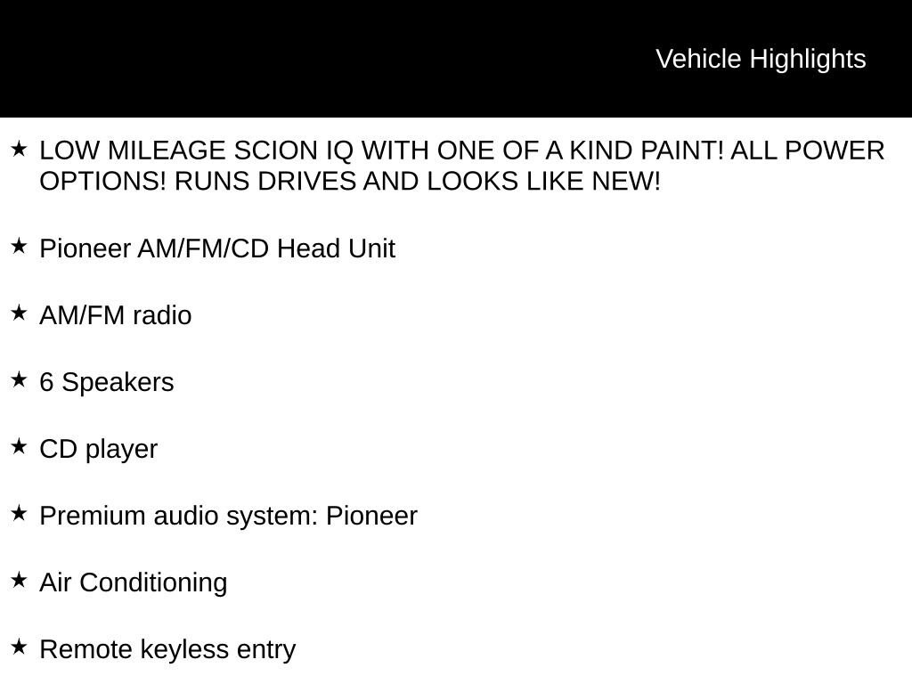 Orange 2013 Scion iQ FWD Continuously Variable (CVT-F) 1.3L 4-Cylinder DOHC Dual VVT-i LOW MILEAGE SCION IQ WITH ONE OF A KIND PAINT! ALL POWER OPTIONS! RUNS DRIVES AND LOOKS LIKE NEW!, 2D Hatchback, 1.3L 4-Cylinder DOHC Dual VVT-i, Continuously Variable (CVT-F), FWD, Orange, Cloth, 5J x 16" Steel Disc Wheels, 6 Speakers, ABS brakes, Air Conditioning, AM/FM radio, Brake assist, CD player, Dual front impact airbags, Electronic Stability Control, Fabric Upholstery, Front Bucket Seats, Illuminated entry, Leather steering wheel, Outside temperature display, Pioneer AM/FM/CD Head Unit, Power windows, Premium audio system: Pioneer, Remote keyless entry, Split folding rear seat, Steering wheel mounted audio controls, Tachometer, Tilt steering wheel, Traction control.