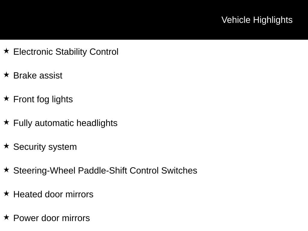 - Security system, Heated door mirrors, Power door mirrors