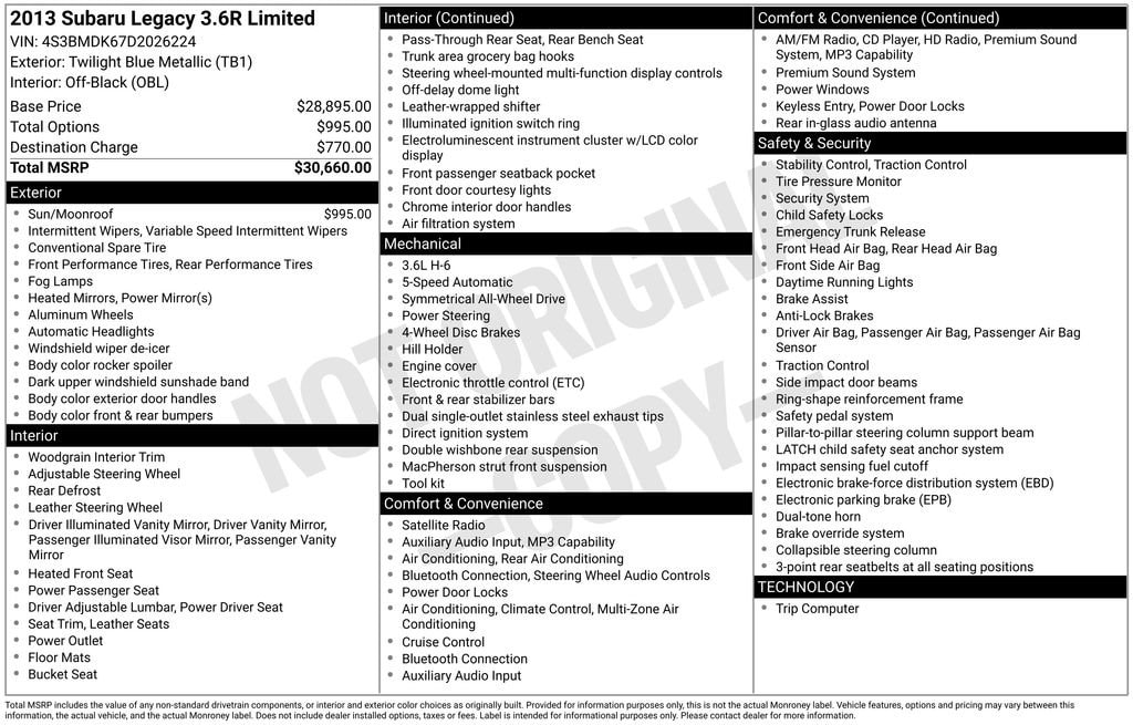 Discover the perfect balance of power, style, and technology in this exceptional 2013 Subaru Legacy 3.6R Limited. With its sleek blue exterior and well-appointed interior, this vehicle is a true standout in its class.