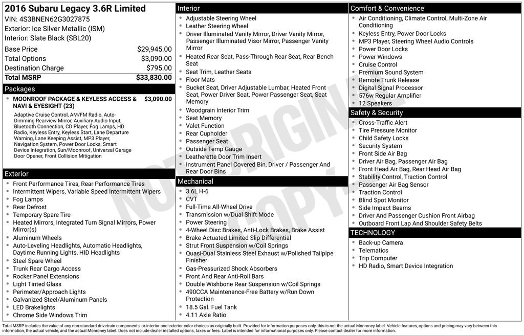 With its sleek silver exterior and well-equipped interior, this Legacy stands out from the crowd. The combination of proven Subaru engineering, advanced features, and exceptional value make this 2016 Legacy 3.6R Limited an exceptional choice for the discerning driver.