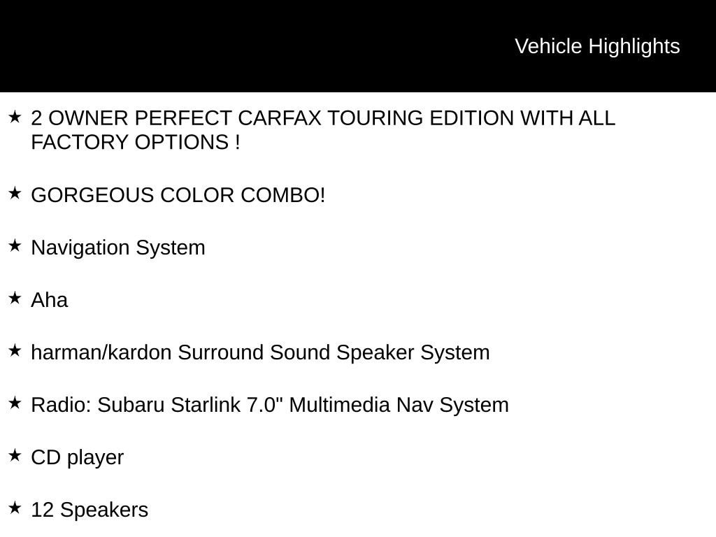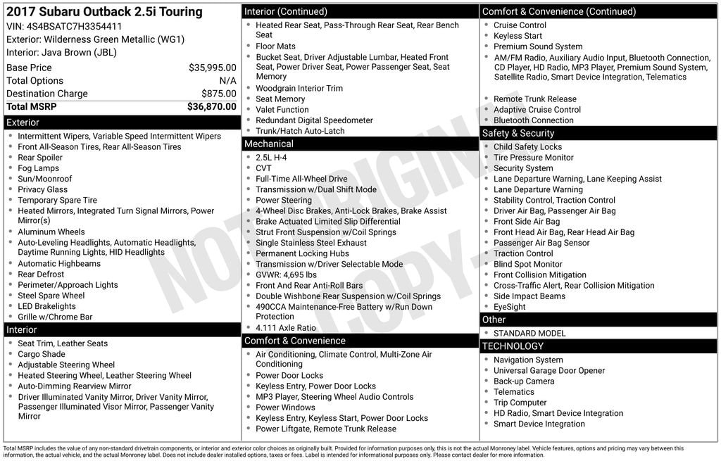 Wilderness Green Metallic 2017 Subaru Outback 2.5i Touring AWD CVT Lineartronic 2.5L 4-Cylinder DOHC 16V 2 OWNER PERFECT CARFAX TOURING EDITION WITH ALL FACTORY OPTIONS !, GORGEOUS COLOR COMBO!, Outback 2.5i Touring, 4D Sport Utility, 2.5L 4-Cylinder DOHC 16V, AWD, Wilderness Green Metallic, Java Leather, 12 Speakers, 4-Wheel Disc Brakes, ABS brakes, Aha, Air Conditioning, AM/FM radio: SiriusXM, Auto High-beam Headlights, Automatic temperature control, Brake assist, CD player, Electronic Stability Control, Exterior Parking Camera Rear, Four wheel independent suspension, Front dual zone A/C, Front fog lights, Fully automatic headlights, harman/kardon Surround Sound Speaker System, Heated rear seats, Heated Reclining Front Bucket Seats, Heated steering wheel, High-Intensity Discharge Headlights, Illuminated entry, Leather Shift Knob, Memory seat, Navigation System, Outside temperature display, Perforated Leather-Trimmed Upholstery, Power Liftgate, Power moonroof, Power passenger seat, Power steering, Power windows, Radio: Subaru Starlink 7.0" Multimedia Nav System, Rear window wiper, Remote keyless entry, Security system, Smartphone Integration, Split folding rear seat, Spoiler, Steering wheel mounted audio controls, Tachometer, Telescoping steering wheel, Tilt steering wheel, Vehicle Information Display, Wheels: 18" x 7.0" Aluminum Alloy w/Machine Finish.