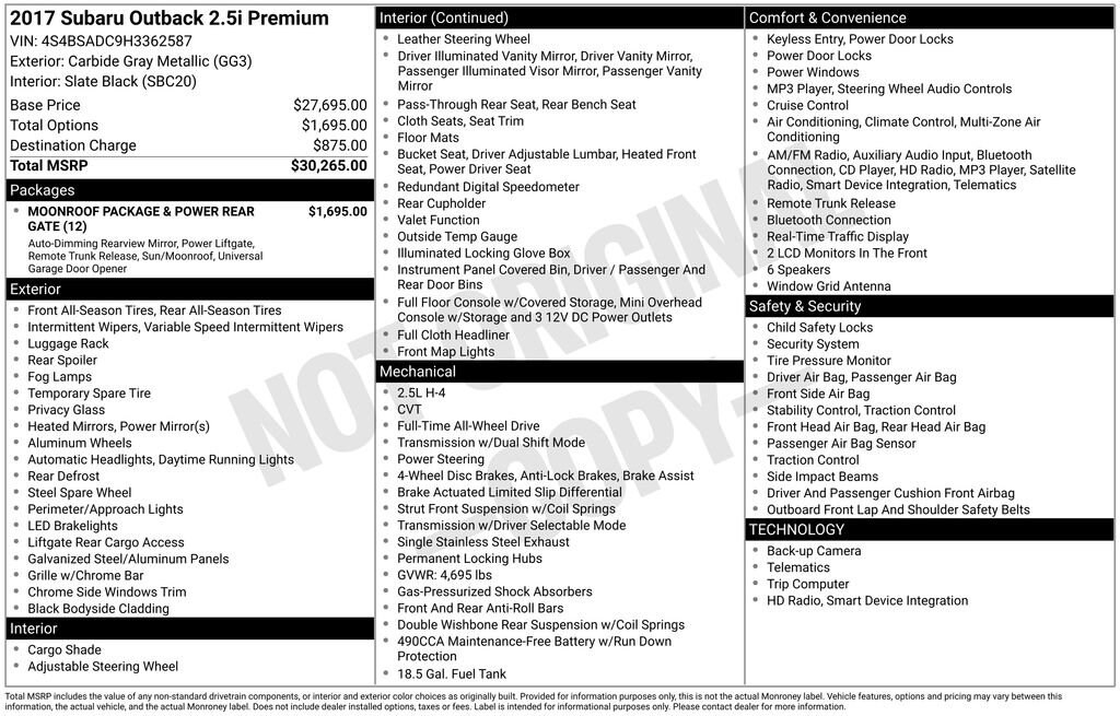 Whether you're tackling the daily commute, embarking on a weekend adventure, or transporting your family in style, this 2017 Subaru Outback 2.5i Premium is the perfect companion. Its exceptional versatility, refined driving dynamics, and impressive list of features make it a standout in the midsize SUV segment.