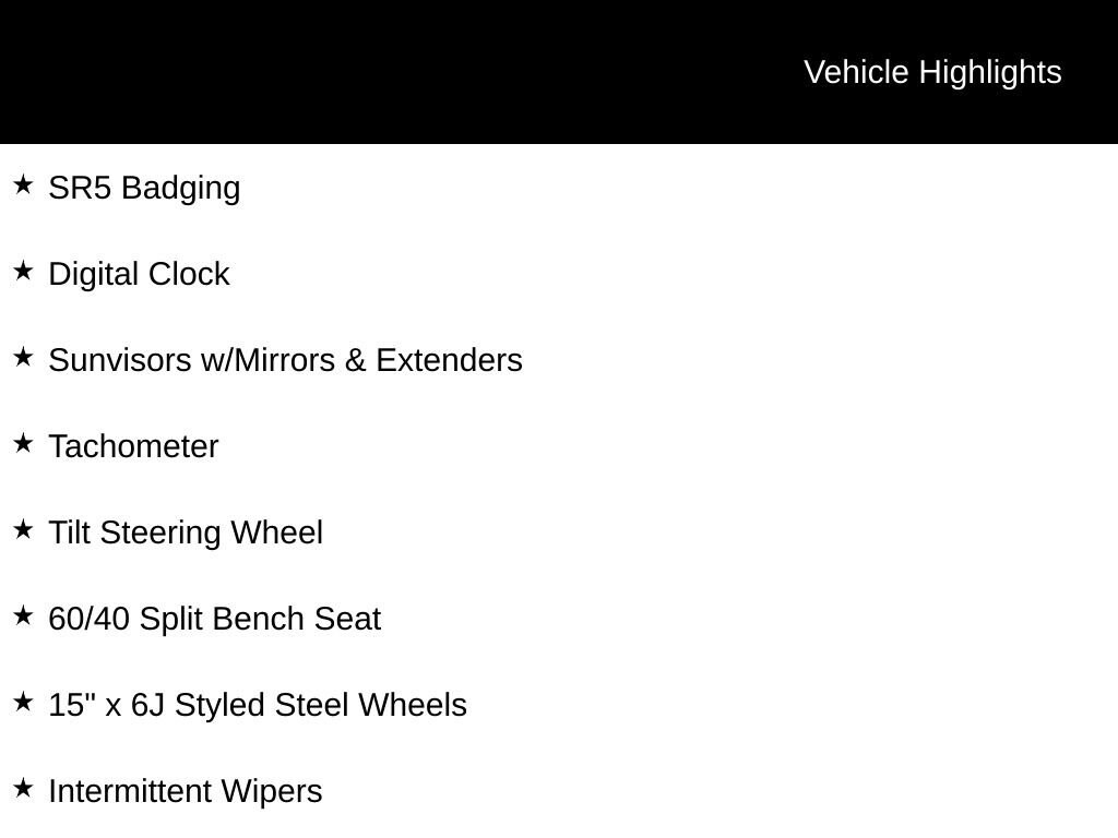 The Tacoma's spacious extended cab provides ample room for passengers and cargo, making it the perfect choice for work, play, or anything in between. The included Convenience Package and SR5 Package elevate the driving experience with a host of premium features, including chrome accents, a digital clock, and a tilt steering wheel.