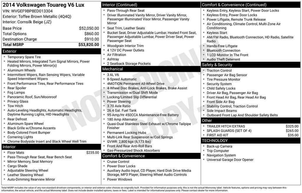PRICE REDUCED!!! Brown Metallic 2014 Volkswagen Touareg 3.6L Executive AWD 8-Speed Automatic 3.6L V6 DOHC Touareg 3.6L Executive, 3.6L V6 DOHC, AWD, Brown Metallic, Cornsilk Beige, 4-Wheel Disc Brakes, Air Conditioning, Alloy wheels, AM/FM radio: SiriusXM, Auto-dimming Rear-View mirror, Automatic temperature control, Delay-off headlights, Electronic Stability Control, Four wheel independent suspension, Front dual zone A/C, Front fog lights, Fully automatic headlights, Garage door transmitter: HomeLink, Heated door mirrors, Heated Front Bucket Seats, High intensity discharge headlights: Bi-Xenon, Illuminated entry, Leather Seating Surfaces, Leather Shift Knob, Outside temperature display, Overhead console, Power door mirrors, Power driver seat, Power Liftgate, Power passenger seat, Power windows, Rain sensing wipers, Rear seat center armrest, Rear window defroster, Remote keyless entry, Security system, Spoiler, Steering wheel mounted audio controls, Tachometer, Telescoping steering wheel, Tilt steering wheel.